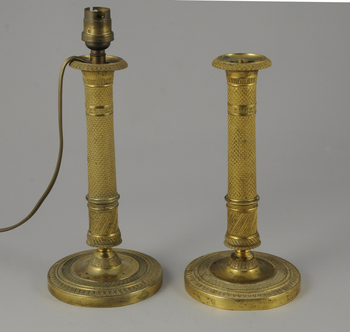 PAIRE de FLAMBEAUX en laiton ciselé et doré. Le pied mouluré à décor de frises de feuilles d'eau, ondes et fleurettes. Ombilic orné de feuillages et raies de perles dans des réserves. Le fût à décor de feuilles d'eau, écailles, bagues, fleurons, entrelacs, côtes torses et raies de perles. Montés à l'électricité.