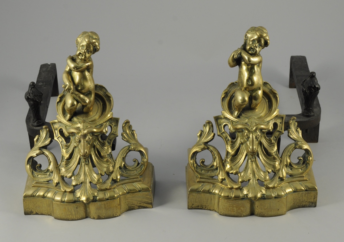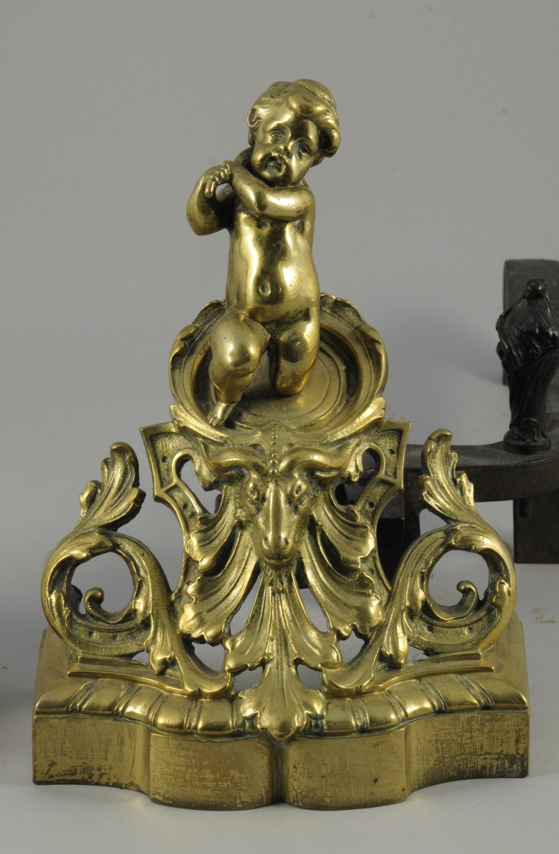 PAIRE DE CHENETS et leurs fers en bronze doré et métal. Décor figurant Hercule enfant, une massue à la main. Il repose sur un cartouche soutenu par une tête de bouc d'où s'épanouissent des rinceaux. Base mouvementée ornée de godrons.