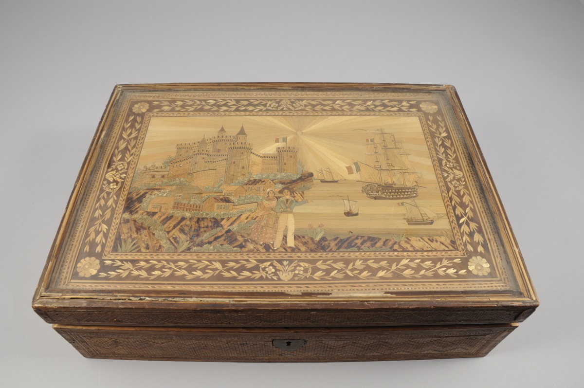 Le couvercle, foncé à l'intérieur d'un miroir, découvre un intérieur séparé, en partie inférieure, en deux compartiments, et comportant, en partie supérieure, un casier amovible. Ce dernier comporte deux coussins de brodeuse et quatre compartiments. Sur le couvercle, protégé par une vitre, scène de port agrémentée d'un château et de bateaux sur lesquels flotte le drapeau tricolore, et animée d'un jeune couple se tenant par le bras. L'ensemble est encadré de tiges entrelacées et de fleurs.À l'intérieur, décor d'un trophée de musique, de vases fleuris et des attributs de l'amour : carquois de flèches, flambeau et deux curs transpercés par la même flèche. Côtés marquetés de chevrons. Entrée de serrure en forme d'écusson.
