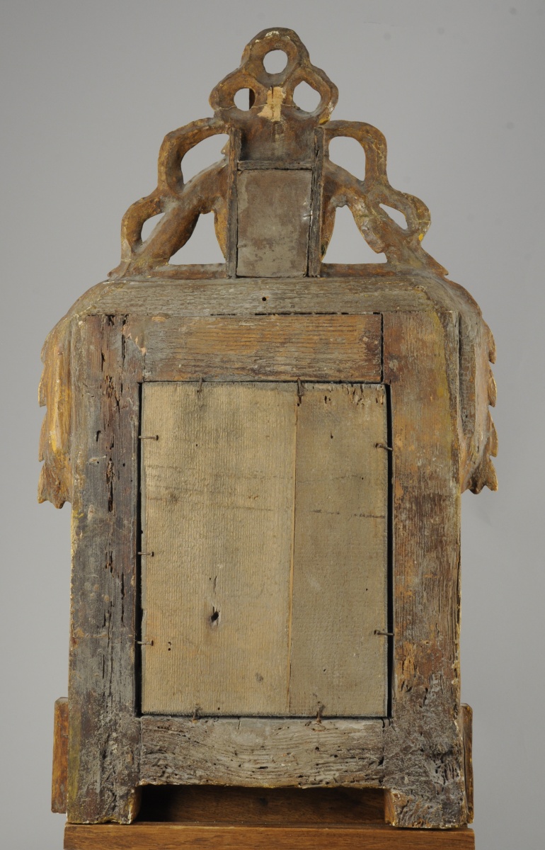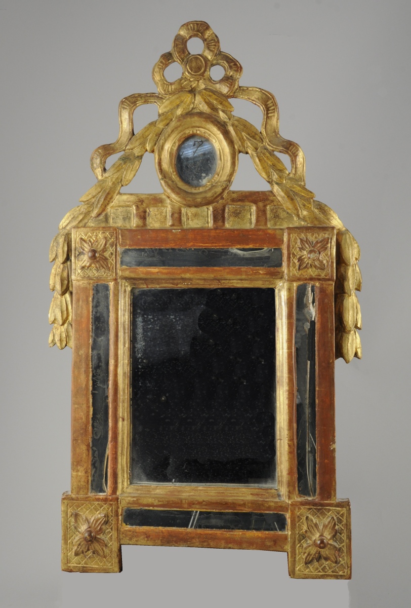 MIROIR À PARE-CLOSES ET FRONTON de forme rectangulaire en bois sculpté, stuqué et doré. Décor aux quatre coins d'un fleuron sur fond de croisillons. Le fronton de forme mouvementée orné d'un ruban noué retenant des guirlandes de laurier et un médaillon foncé d'un miroir.
