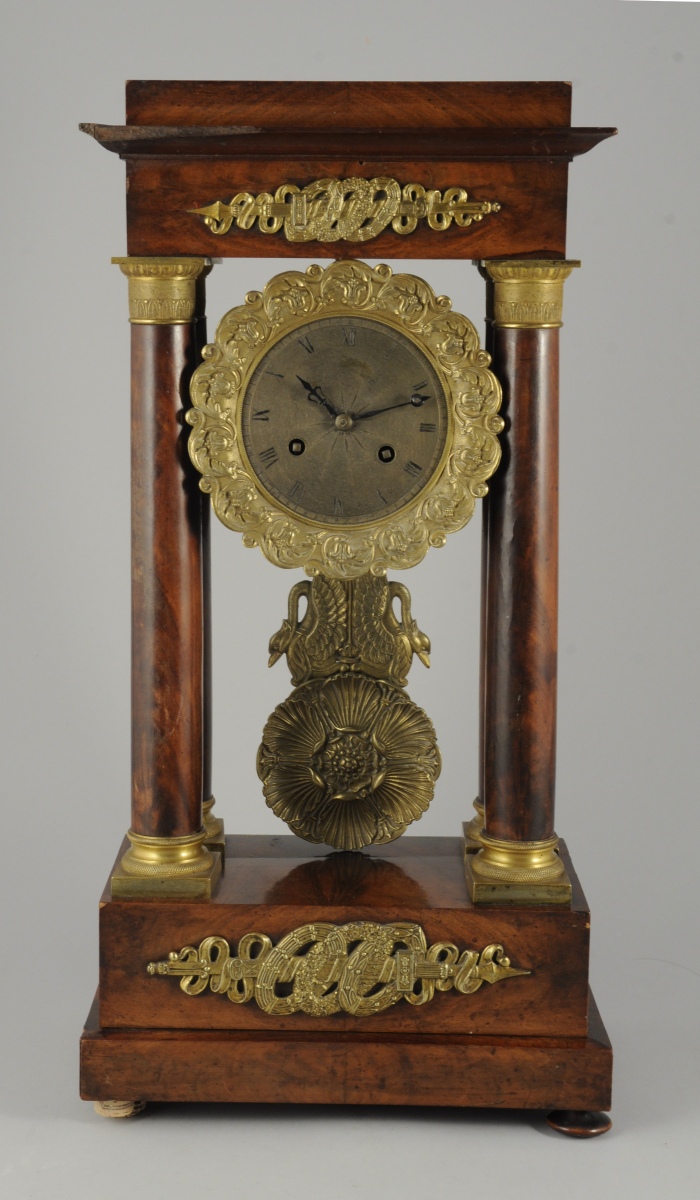 PENDULE PORTIQUE en placage d'acjou reposant sur quatre piliers doriques sur une plainte.Ornementation de bronze doré : deux caducées de Mercure, chapiteaux et piétements des colones, balancier aux cygnes et feuille de pavots. Cadran en bronze doré feuillagé gravé de chiffres romains. Aiguilles fleur-de-lysées.