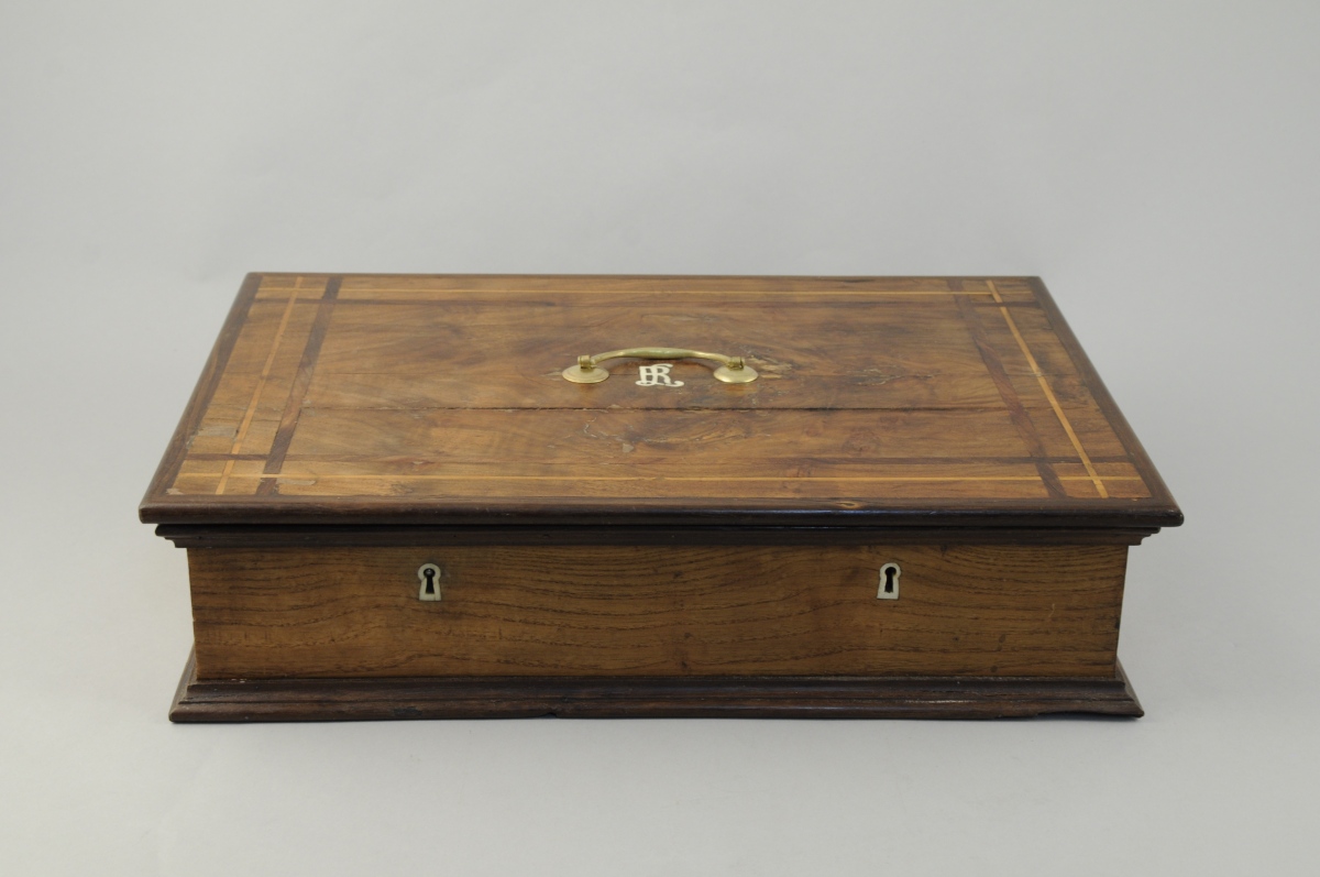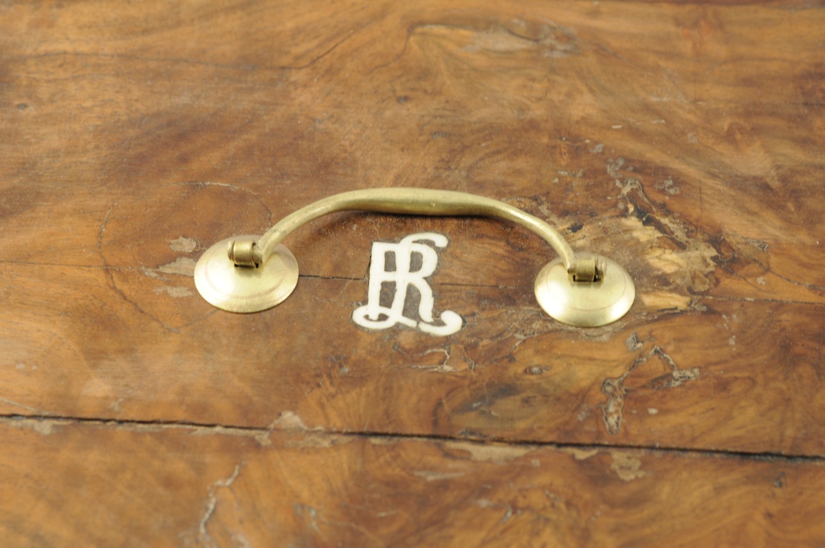COFFRET de forme rectangulaire en placage de ronce de noyer, chêne et autres bois. Il présente en façade deux entrées de serrure cerclées d'os. Le couvercle est incrusté du chiffre "RL" En os et est agrémenté d'une poignée en laiton (rapportée).