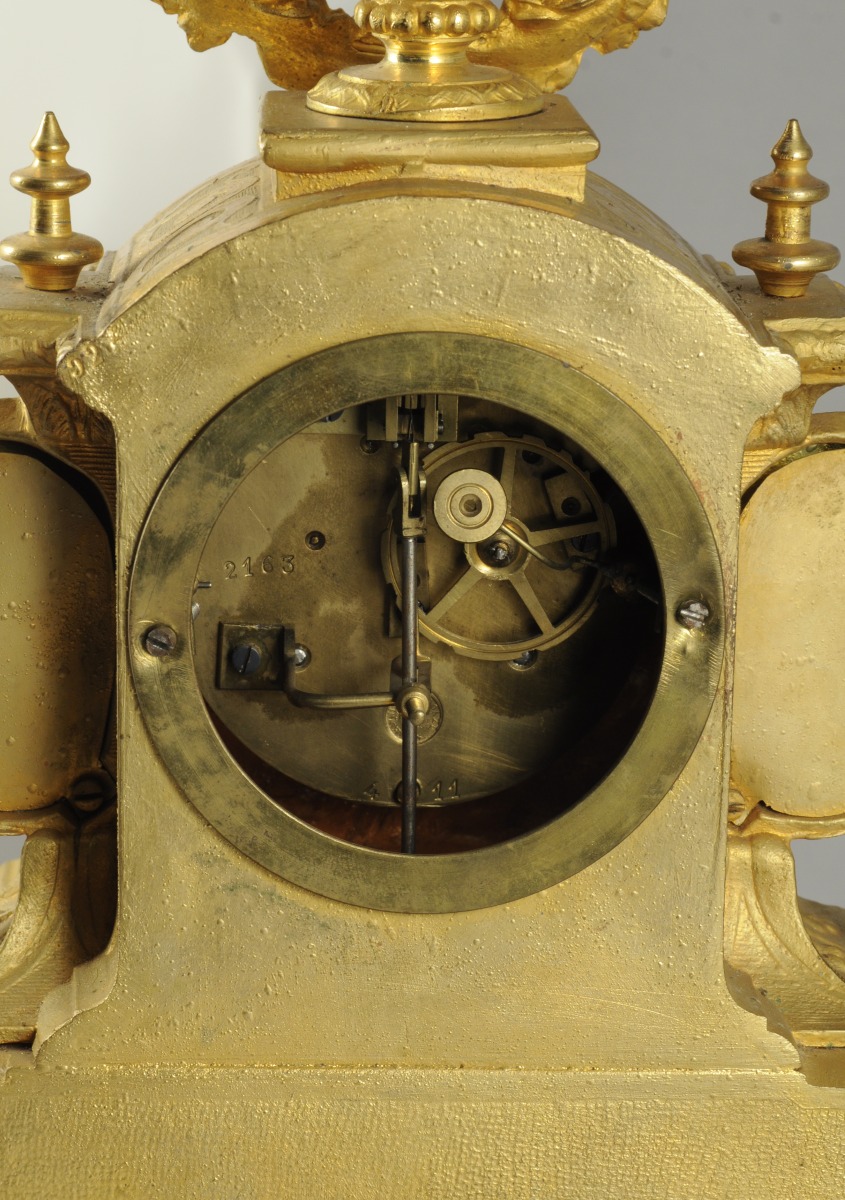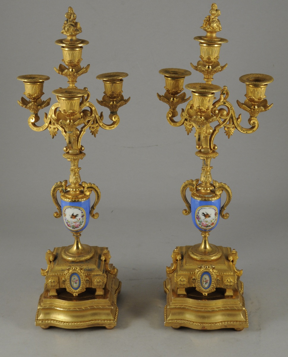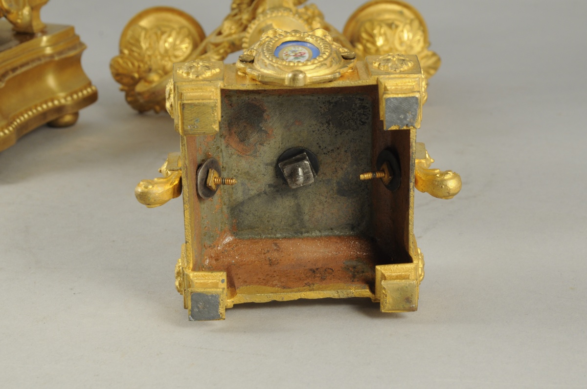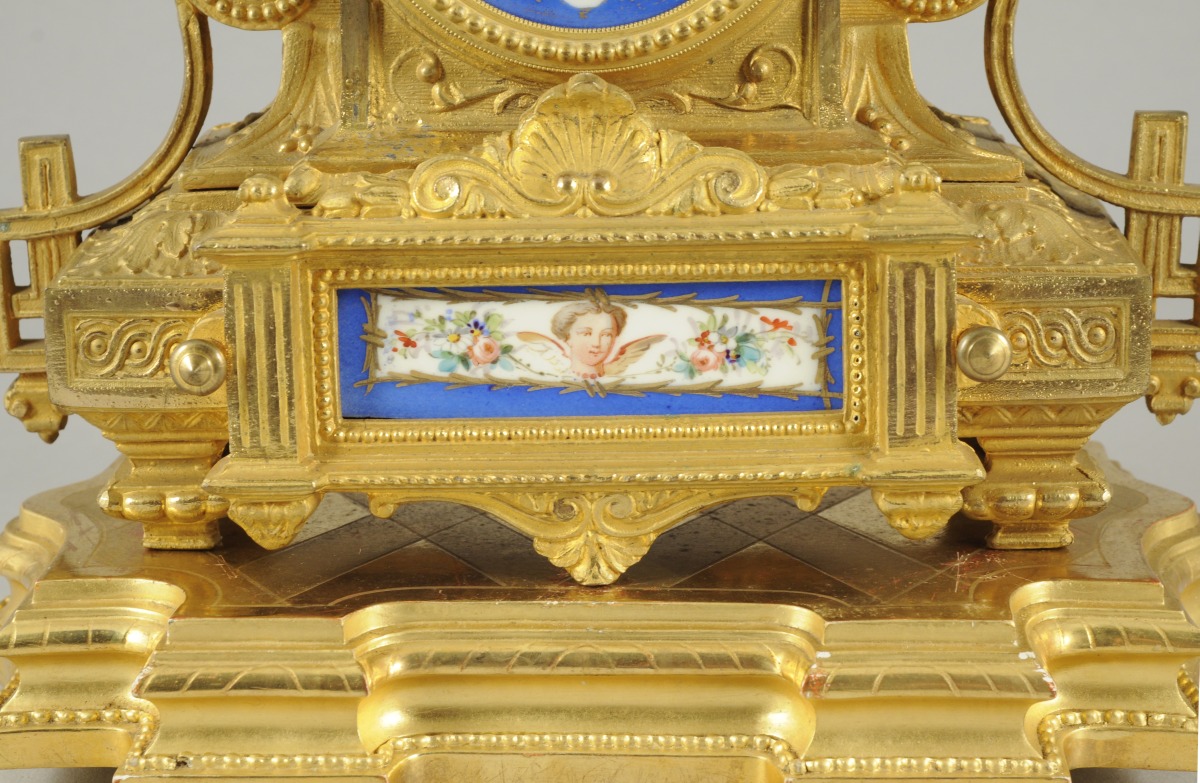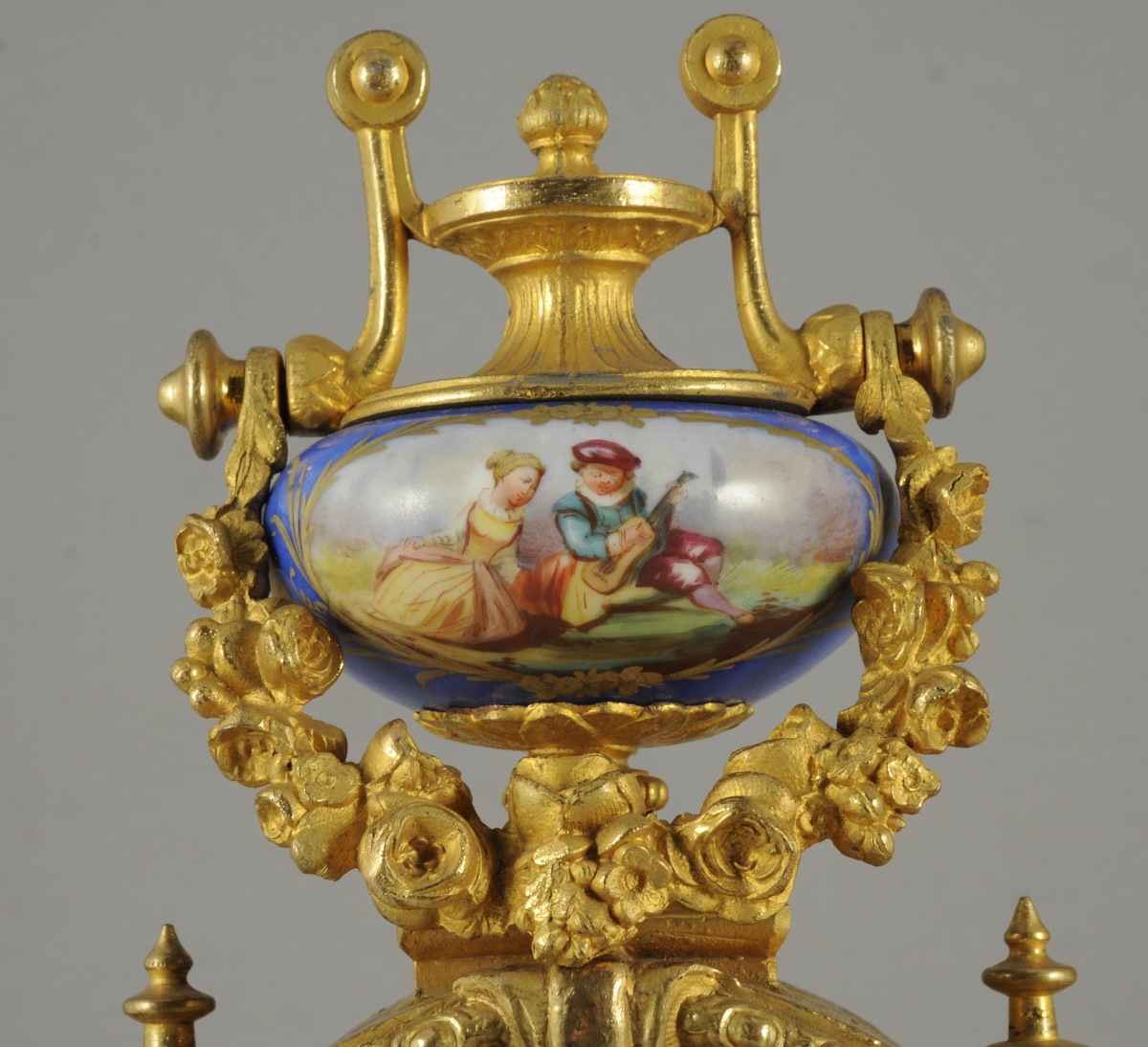 GARNITURE DE CHEMINÉE en bronze doré composée d'une pendule et d'une paire de candélabres. La pendule de forme architecturée reçevant un riche décor de raies de perles, feuilles d'acanthe, volutes feuillagées, coquilles stylisées et guirlande fleurie, elle est sommée d'une urne. Les candélabres à quatre lumières en bronze ciselé et doré. Ornementation de plaques de porcelaine à décor de putti, scène galante, oiseaux et fleurs. Cadran en porcelaine indiquant les heures en chiffres romains signé "Paul Lava à St Denis".