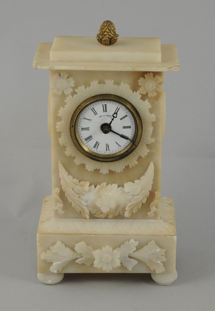 PENDULE BORNE en albâtre reposant sur quatre pieds en boule applatie. Décor en relief, de fleurs, feuilles d'acanthe stylisées, feuilles d'eau, et disques, sculpté et appliqué. Une pomme de pin en bronze doré à l'amortissement, probablement rapportée. Cadran émaillé blanc à douze chiffres romains. Mouvement signé "G.R / PARIS"