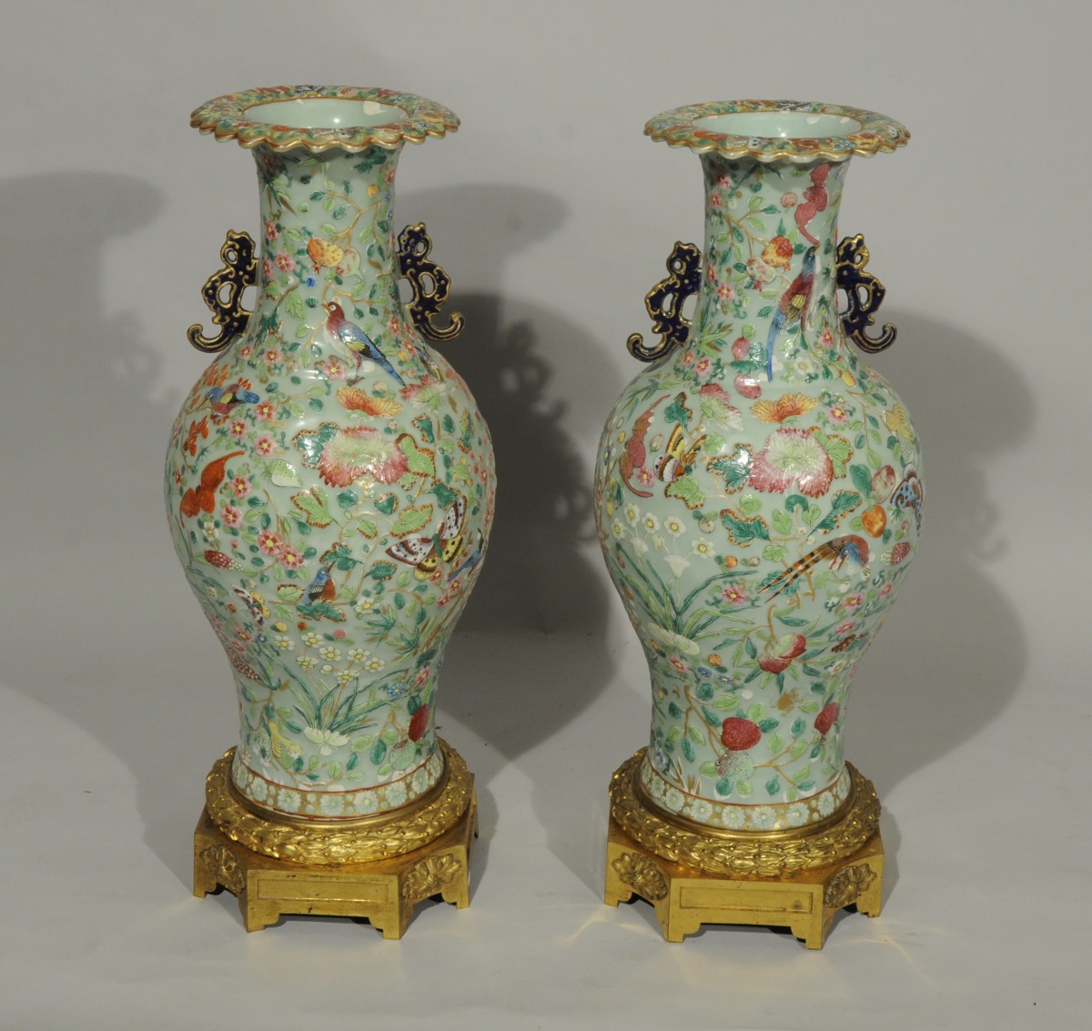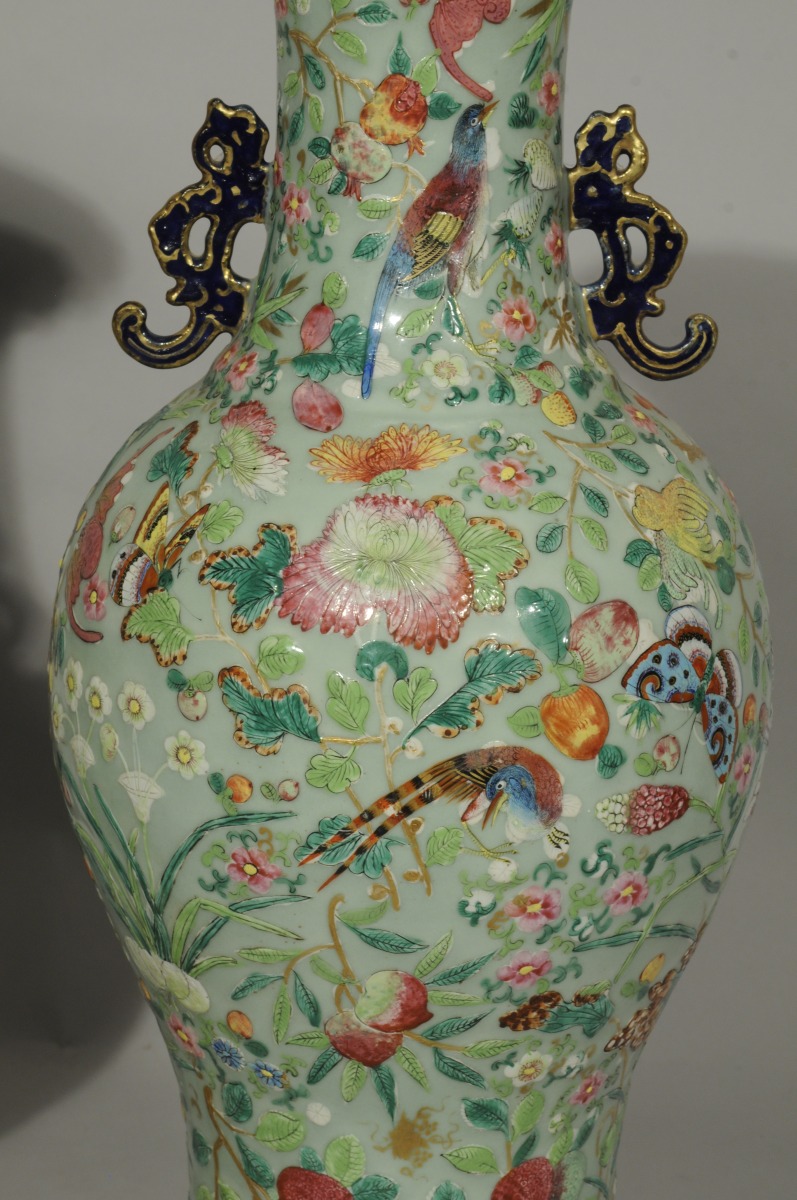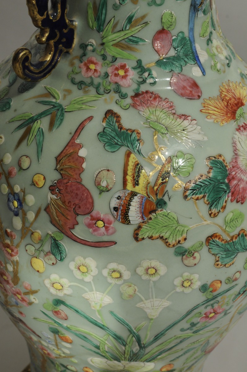 PAIRE de VASES balustre en porcelaine. Décor polychrome et or en plein et en léger relief sur fond vert d'eau d'oiseaux, papillons, chauves-souris, fleurs, fruits et feuillages. Frises de fleurs blanches sur le pied. Anses plates en forme de dragon bleu nuit et or et col évasé polylobé.