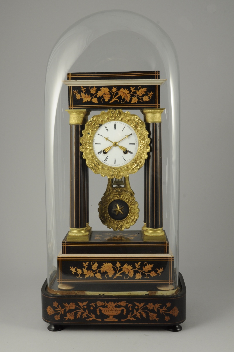 PENDULE PORTIQUE en forme de temple en bois noirci. Décor en marqueterie de bois clair de pampres et filets. Cadran émaillé blanc à chiffres romains bordé d'une frise en bronze ciselé, aiguilles en forme de flèches. Ornementation de bronzes dorés : chapiteaux et bases. Sur un socle à décor de panier fleuri et sous un globe de verre.