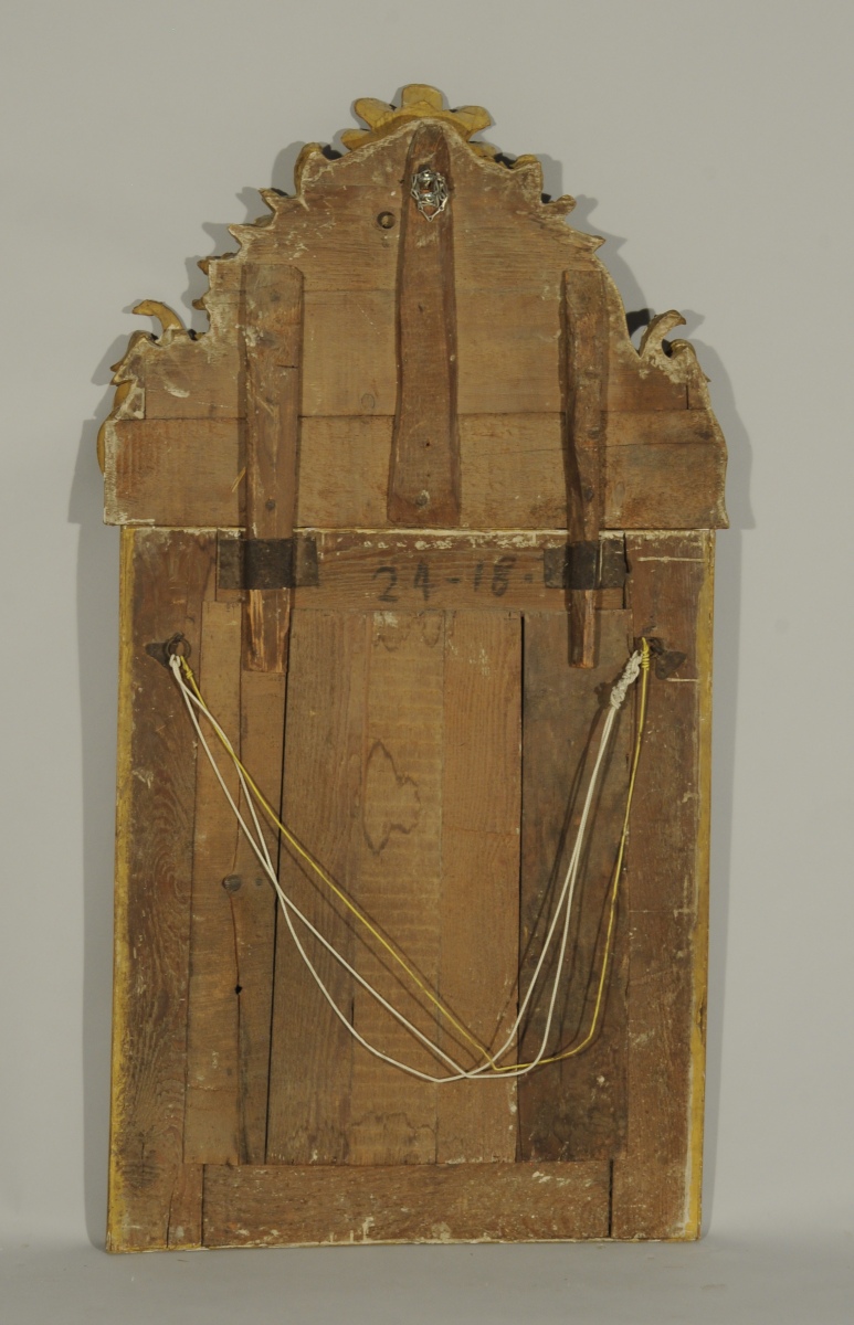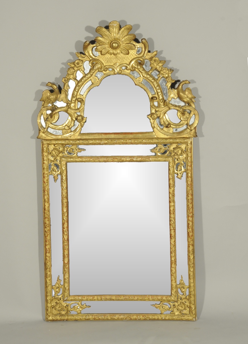 MIROIR À PARE-CLOSES ET FRONTON, de forme rectangulaire en bois stuqué, doré et sculpté de rinceaux feuillagés et coquilles. Le fronton de forme mouvementée orné d'une palme, de godrons, de croisillons et de rinceaux fleuris sur lesquels sont posés deux oiseaux.