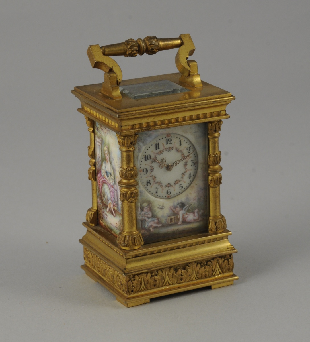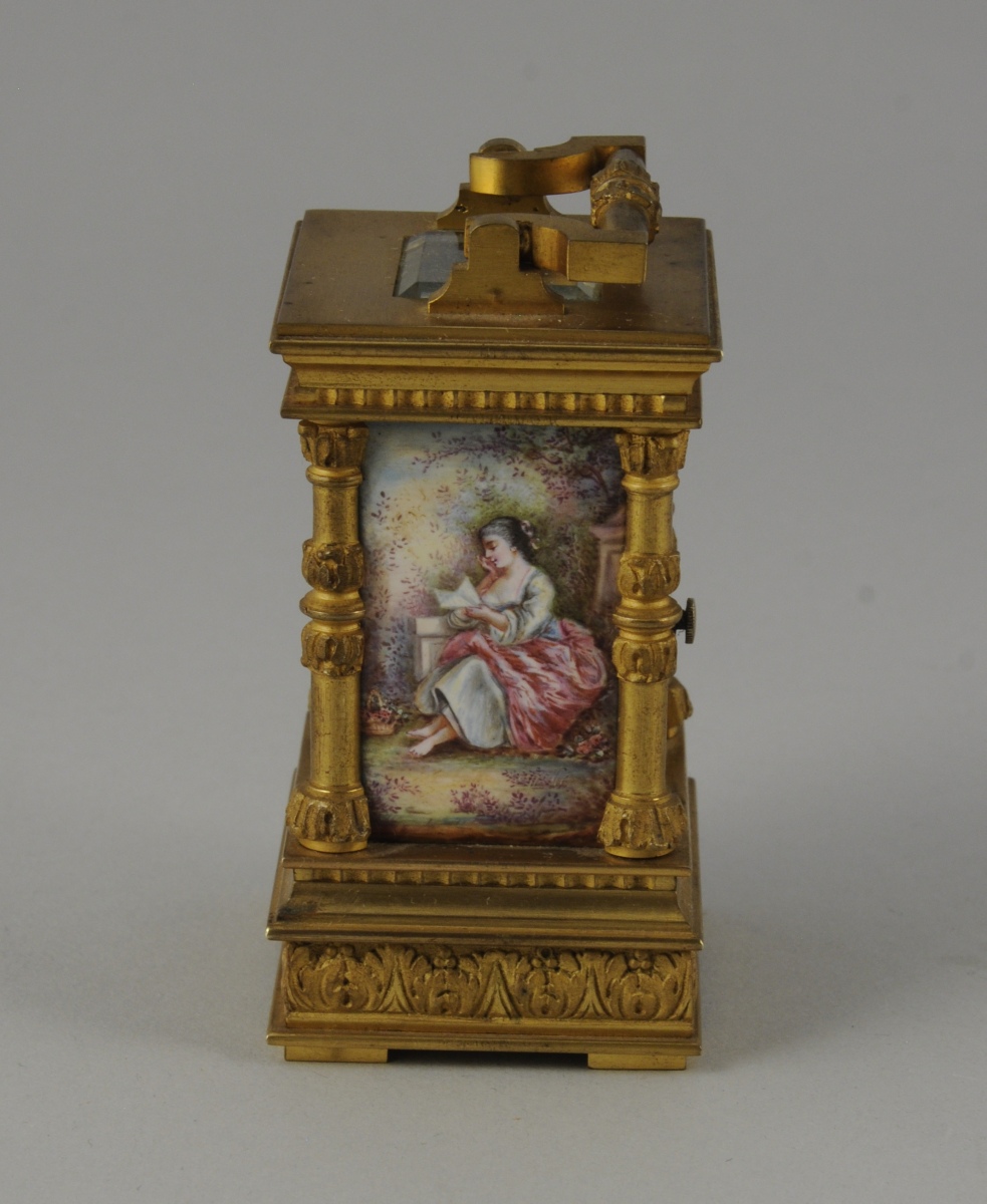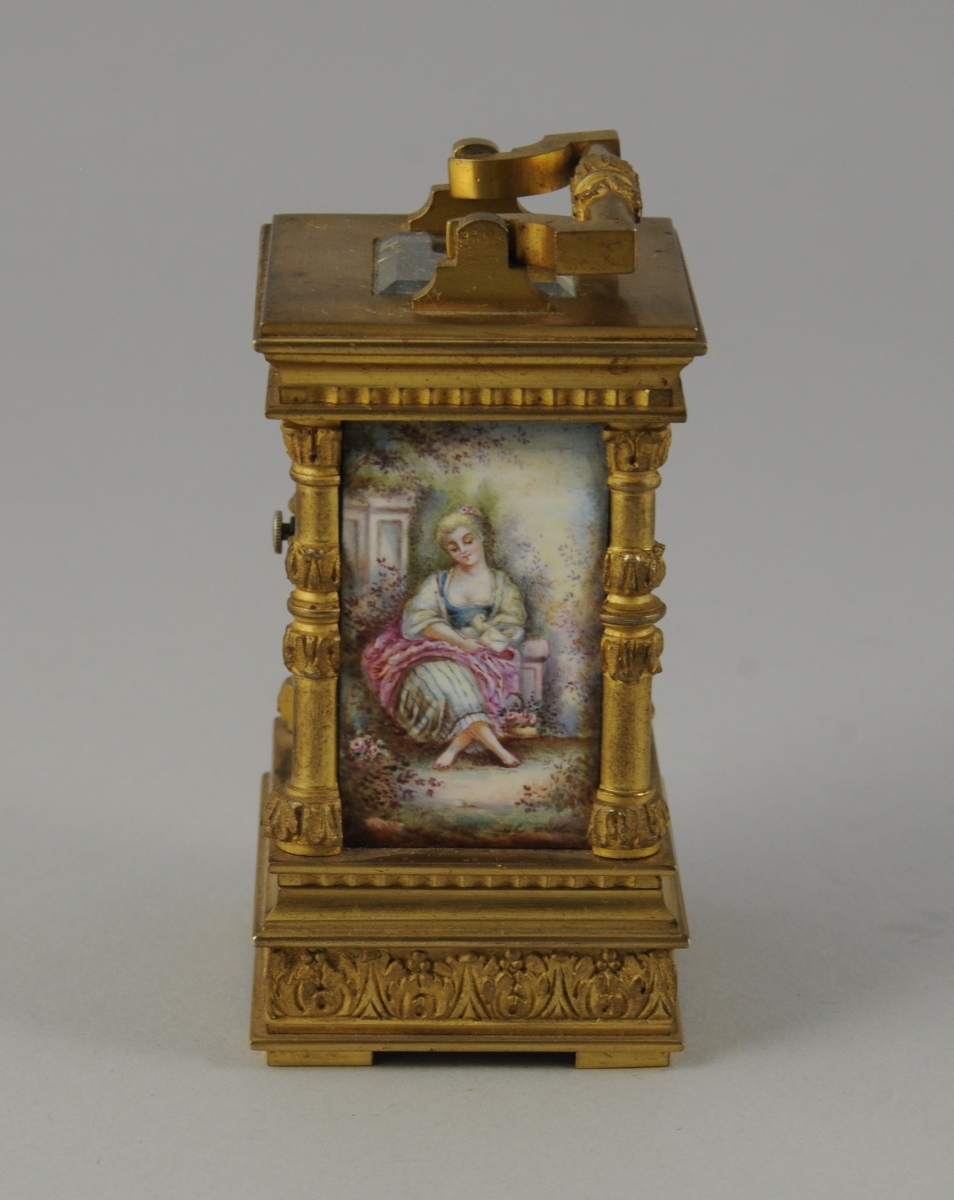 PENDULETTE D'OFFICIER en bronze ciselé et doré. Le cadran émaillé blanc indiquant les heures et les quarts en chiffres arabes orné de guirlandes de fleurs polychromes. Il s'incrit dans une plaque émaillée à décor polychrome figurant deux amours jouant avec un oiseau. Les côtés sont également garnis d'une plaque émaillée figurant pour l'un une jeune femme lisant et pour l'autre une jeune femme à la colombe. Montants à demi-colonnes engagées ornées de bagues feuillagées. La base ciselée d'une frise de feuilles d'acanthe stylisées. Panneaux vitrés en biseau, celui du sommet gravé d'une couronne de marquis. Dans son coffret en maroquin orné de croisillons et d'une couronne de marquis.