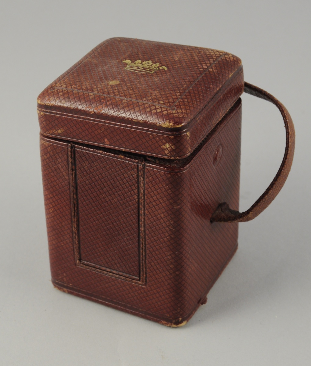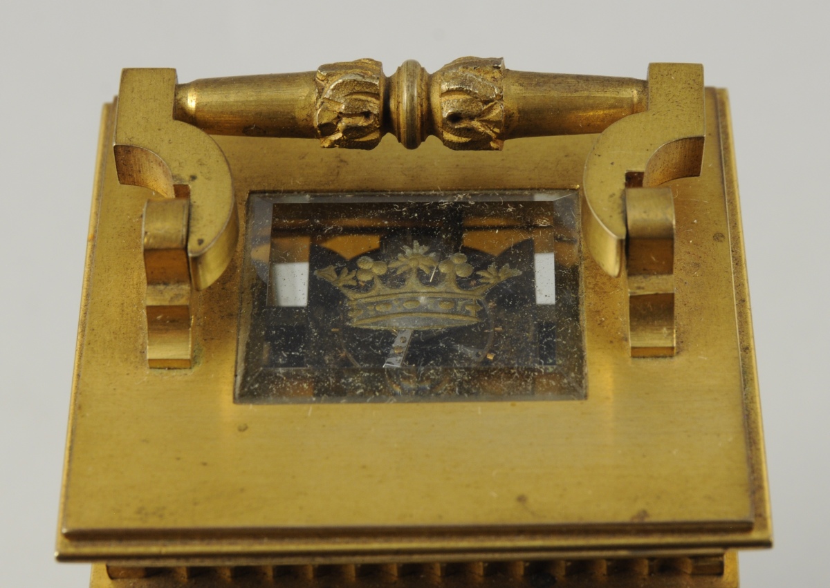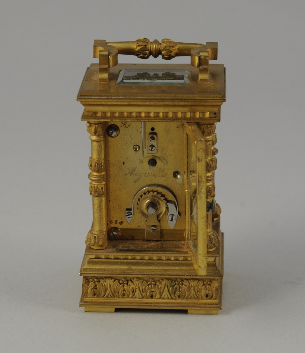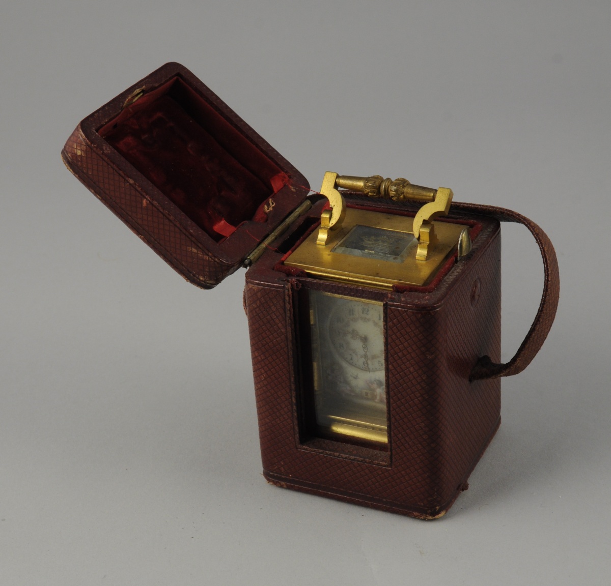 PENDULETTE D'OFFICIER en bronze ciselé et doré. Le cadran émaillé blanc indiquant les heures et les quarts en chiffres arabes orné de guirlandes de fleurs polychromes. Il s'incrit dans une plaque émaillée à décor polychrome figurant deux amours jouant avec un oiseau. Les côtés sont également garnis d'une plaque émaillée figurant pour l'un une jeune femme lisant et pour l'autre une jeune femme à la colombe. Montants à demi-colonnes engagées ornées de bagues feuillagées. La base ciselée d'une frise de feuilles d'acanthe stylisées. Panneaux vitrés en biseau, celui du sommet gravé d'une couronne de marquis. Dans son coffret en maroquin orné de croisillons et d'une couronne de marquis.