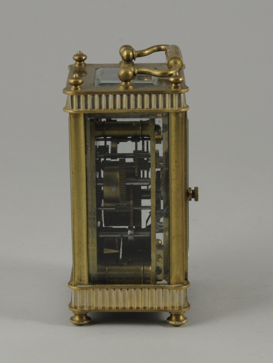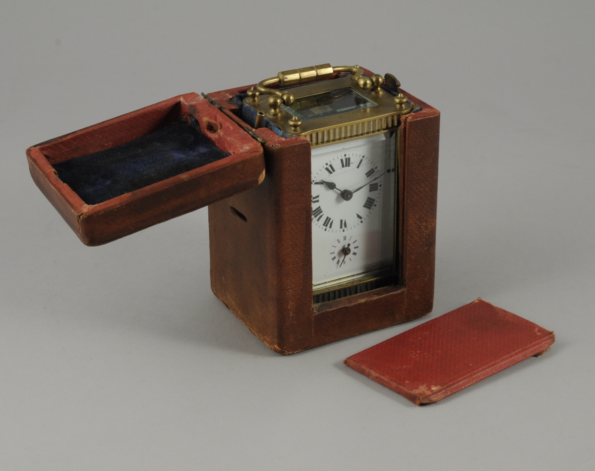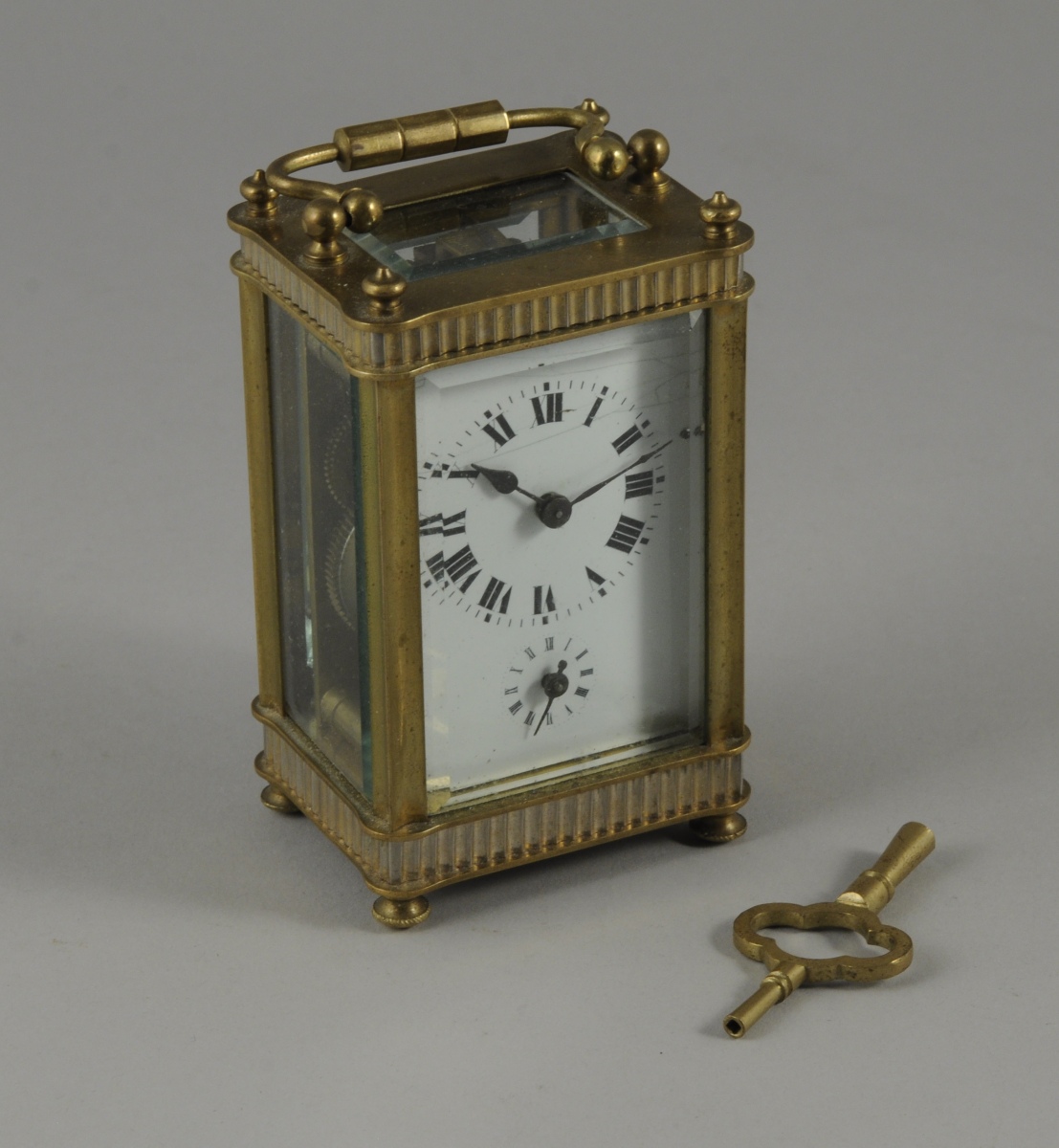 PENDULETTE D'OFFICIER en laiton. Cadran émaillé blanc (fêles), indiquant les heures en chiffres romains. Réveil avec cadran secondaire en chiffres arabes. Marquée "8-11-90".