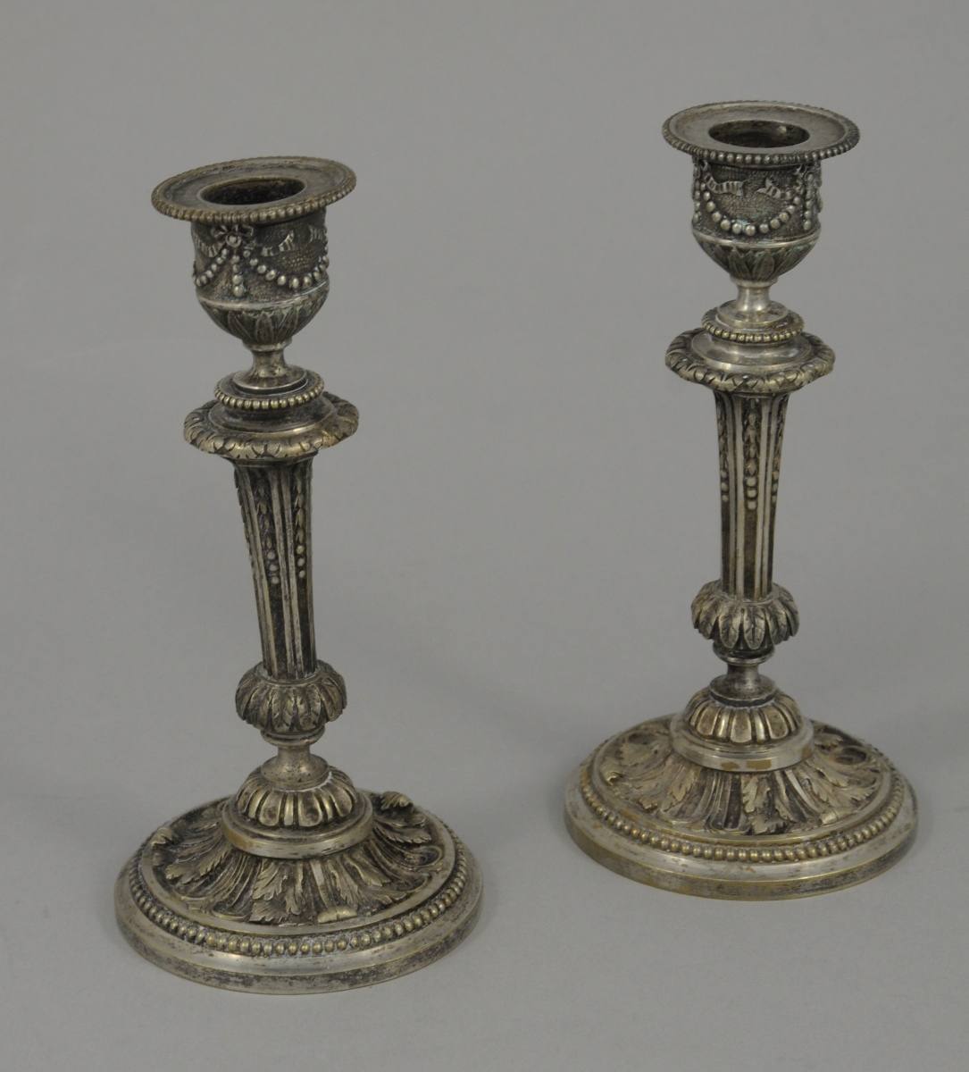 Paire de petits FLAMBEAUX en bronze argenté à motifs de rais de perle, feuilles d'acanthes, fût en colonne cannelée, bobèche enrubannés à décor de feuilles de lotus. Poinçonnés "BD" et numérotés "133".