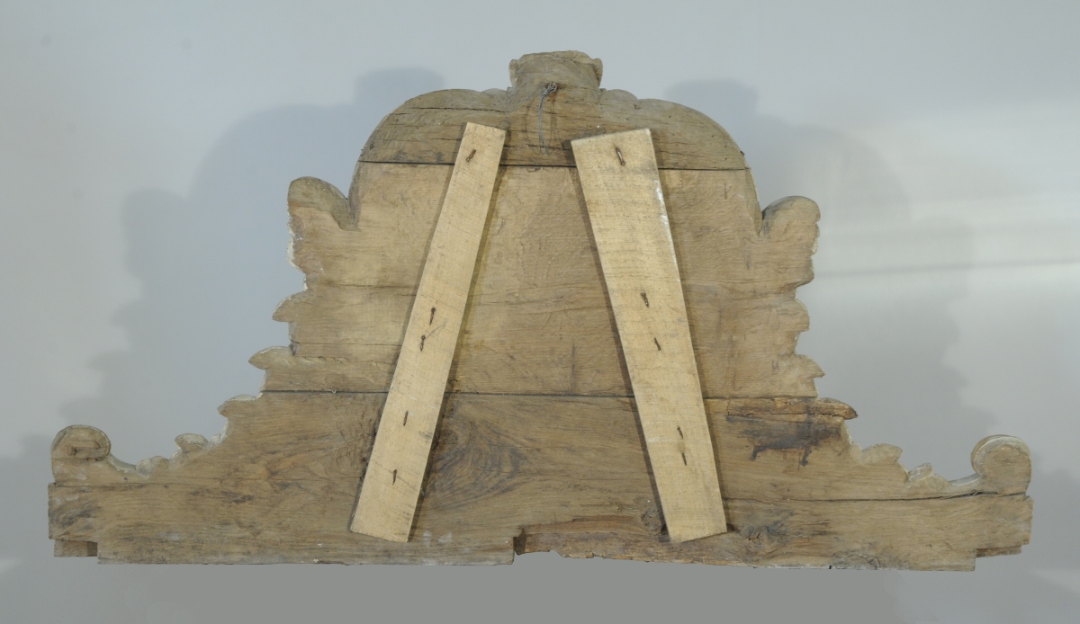 FRONTON en BOIS mouluré, sculpté et laqué jaune, bleu et or à décor d'une large coquille sommée d'une feuille d'acanthe et entourée de rinceaux feuillagés.