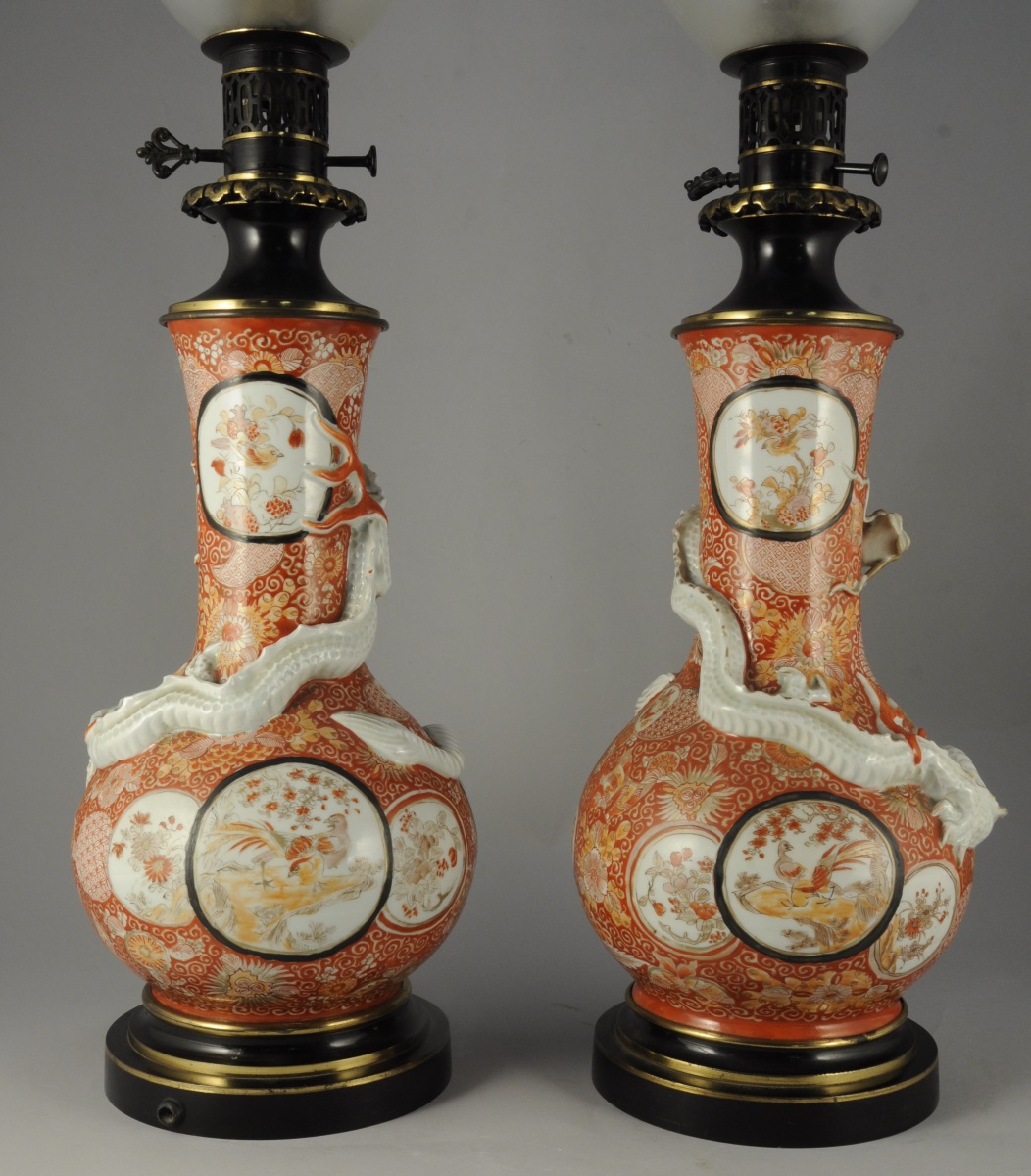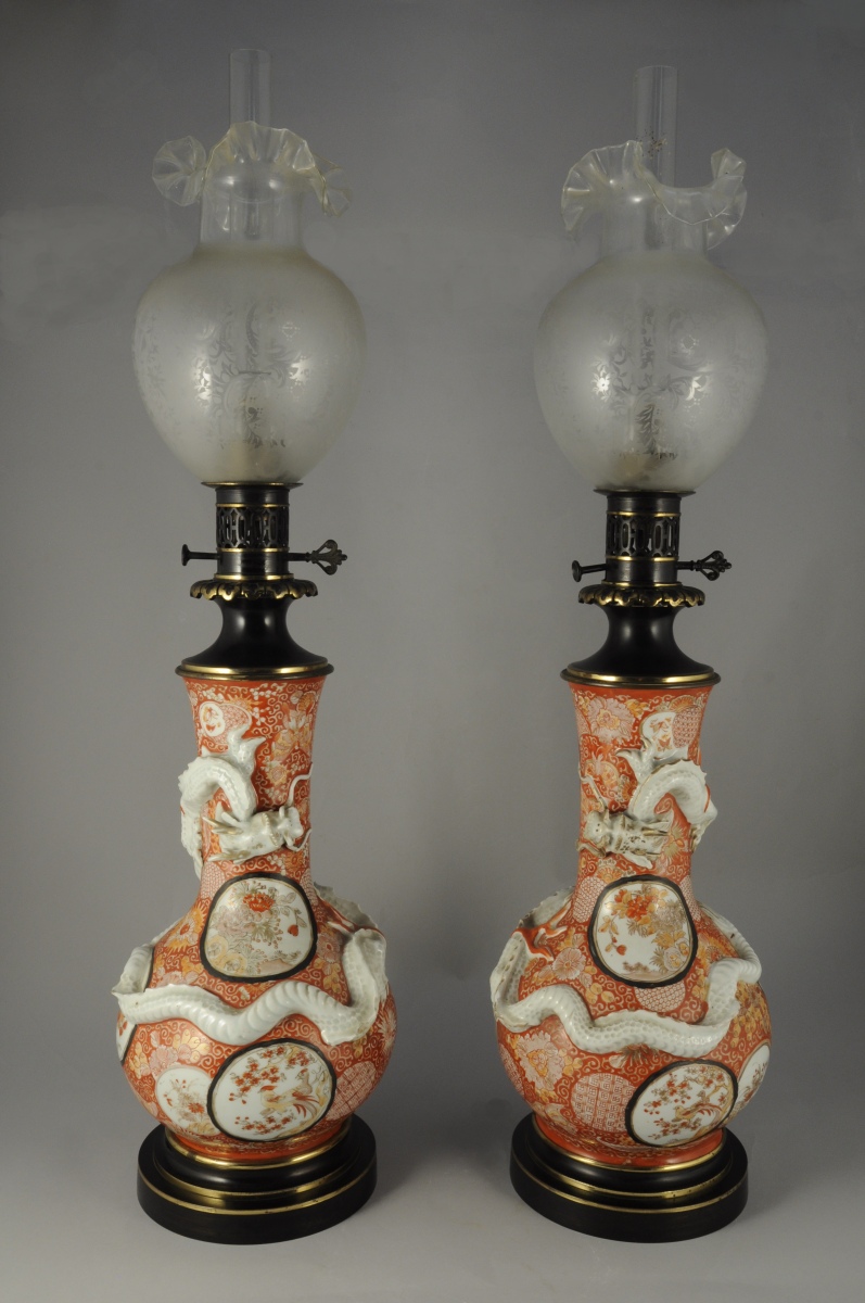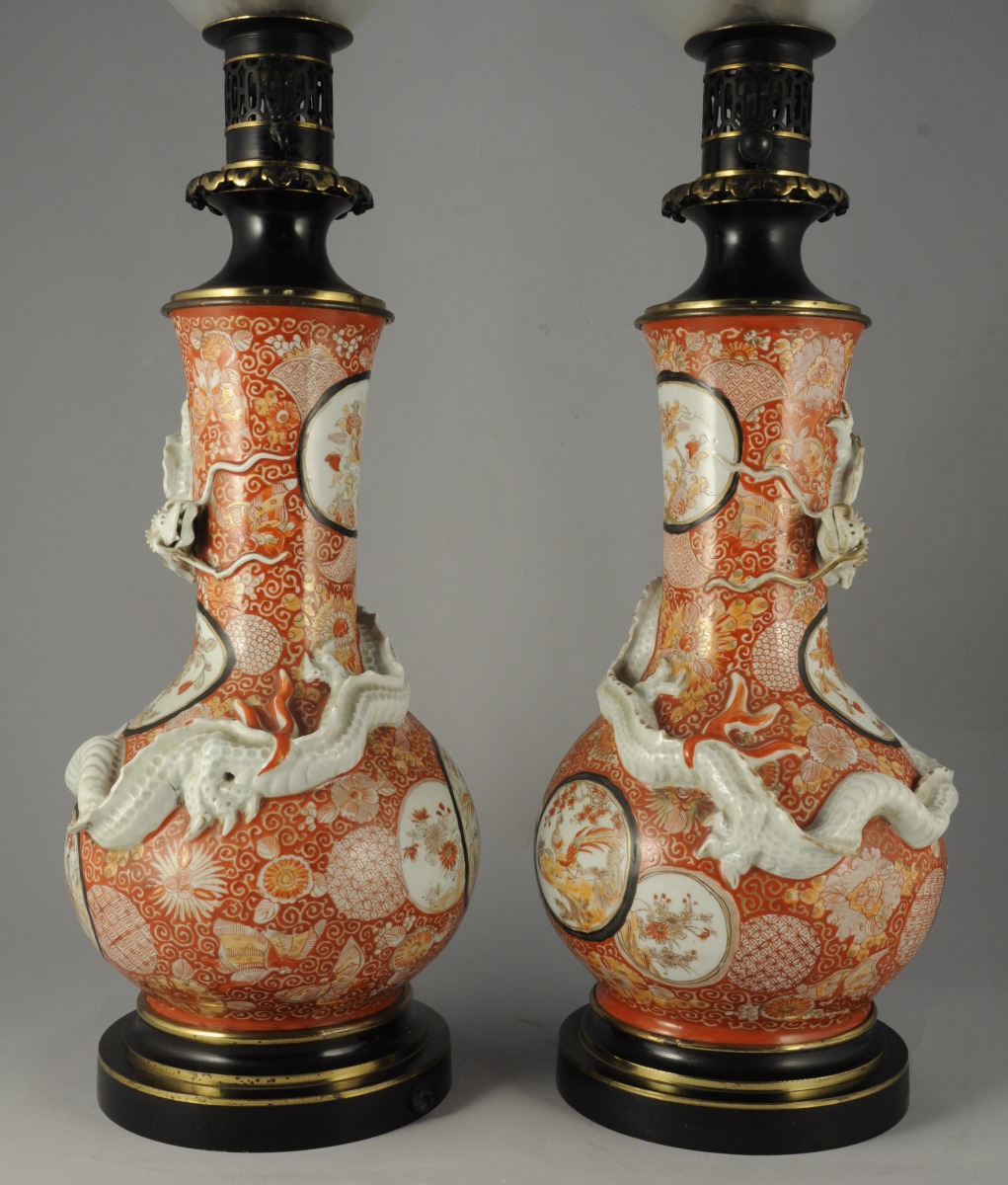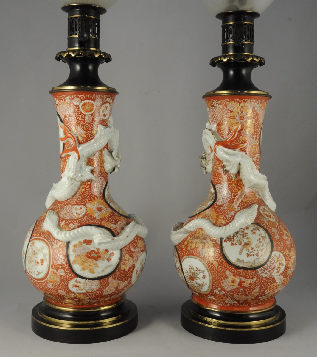 PAIRE de LAMPES à PÉTROLE, en porcelaine blanche à decor de couleur corail et or dans des reserves de fleurs et d'oiseaux - un dragon en relief entoure la panse et le col. Japon.