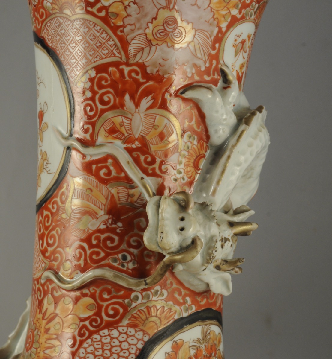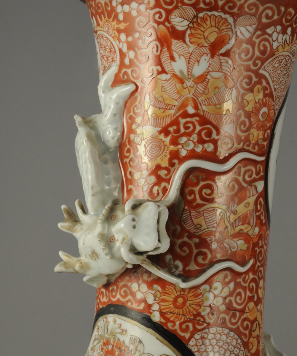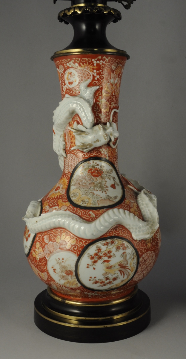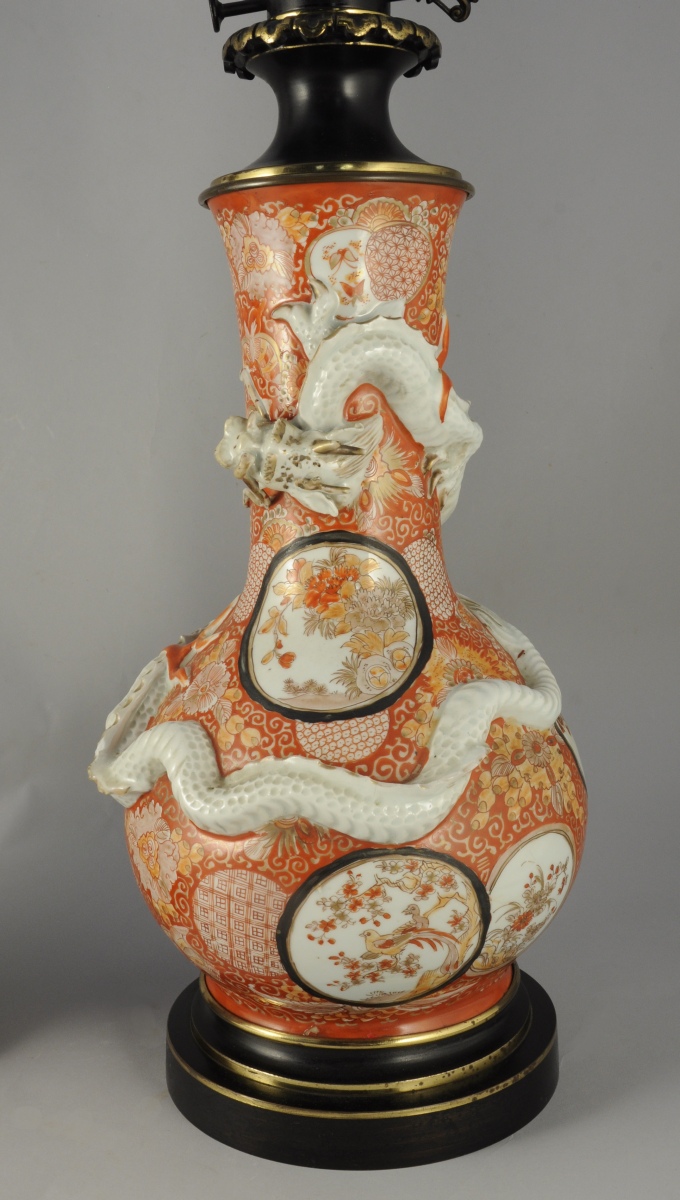 PAIRE de LAMPES à PÉTROLE, en porcelaine blanche à decor de couleur corail et or dans des reserves de fleurs et d'oiseaux - un dragon en relief entoure la panse et le col. Japon.