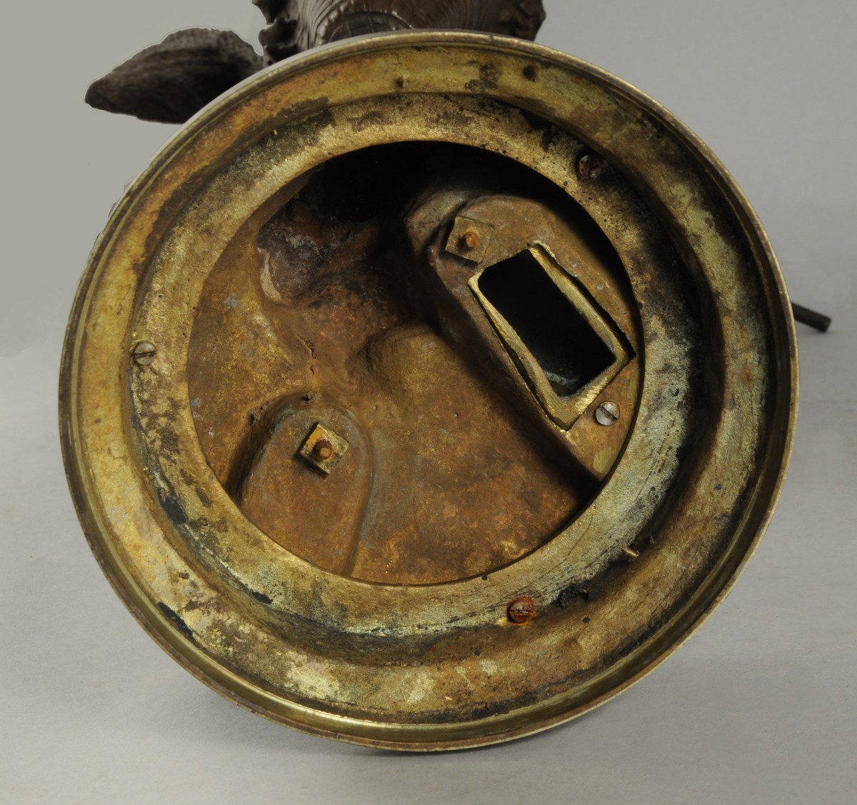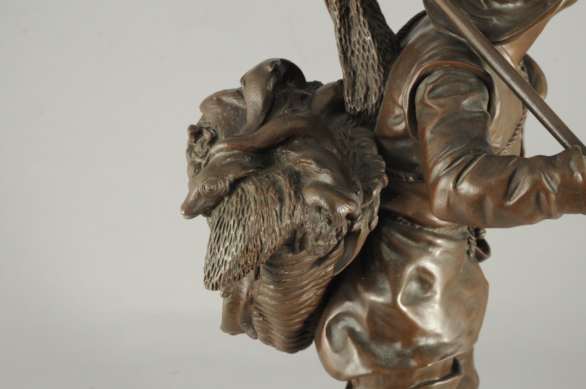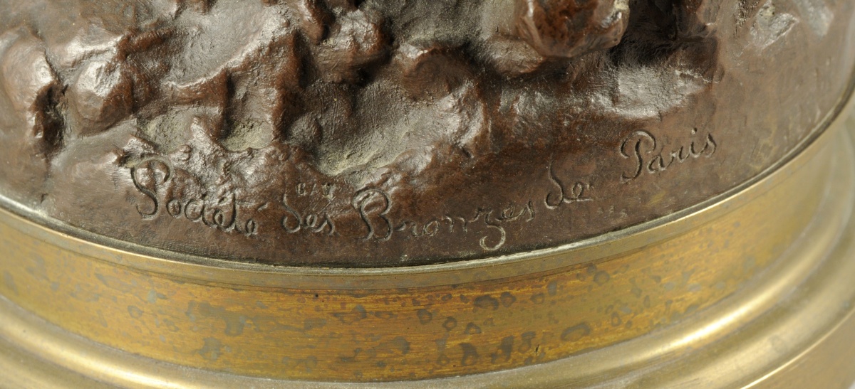 Bronze patiné sur un socle en bronze vif. Signé "Hyp Moreau" et "Société des bronzes de Paris".