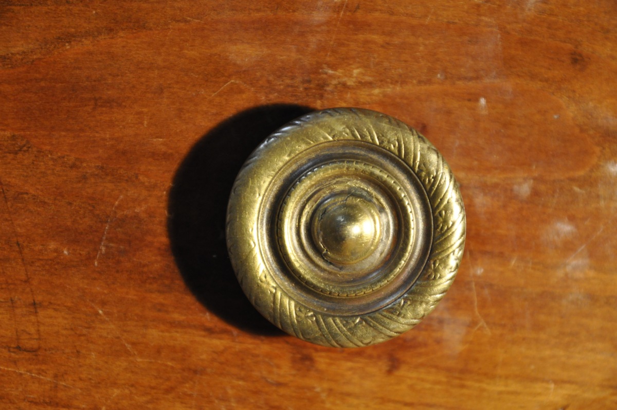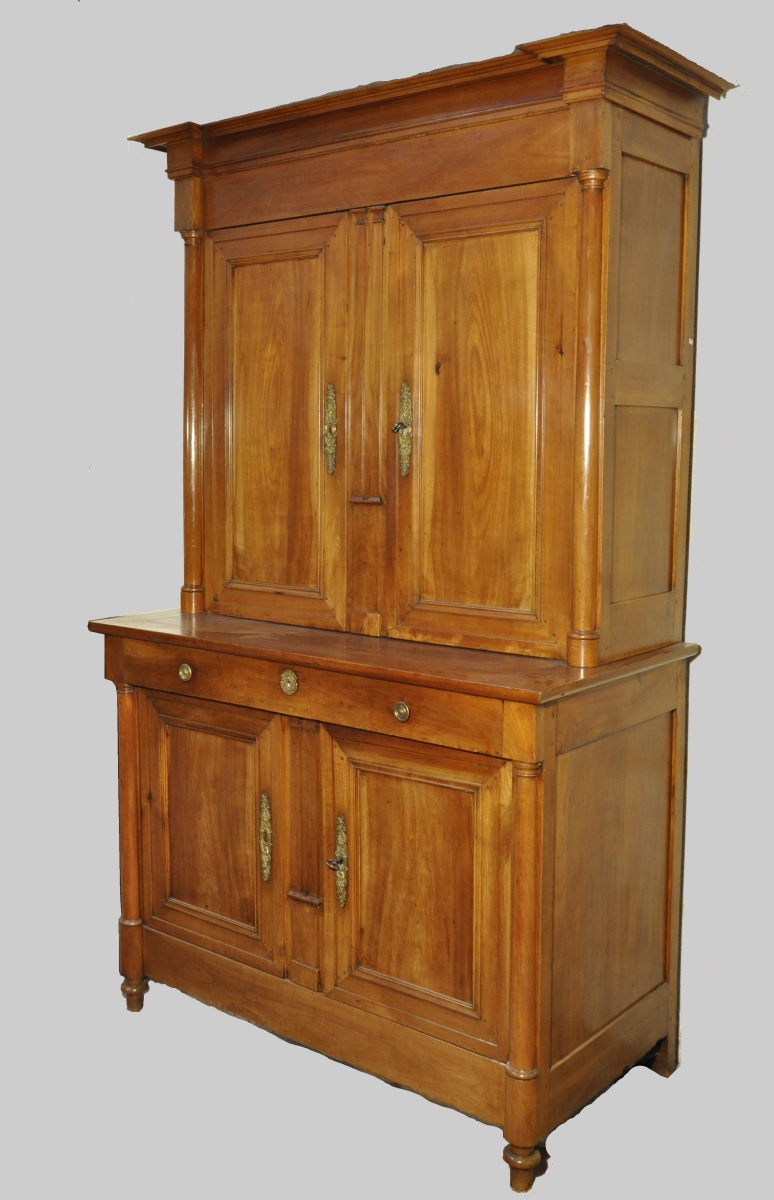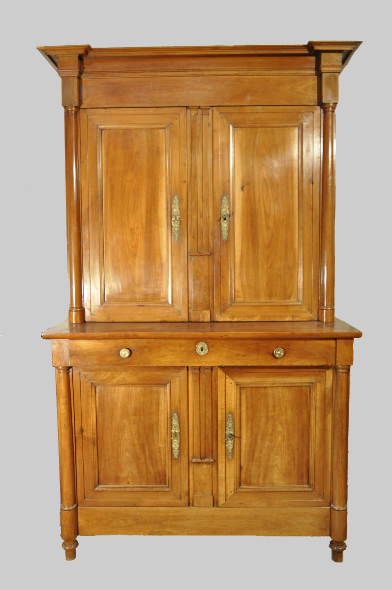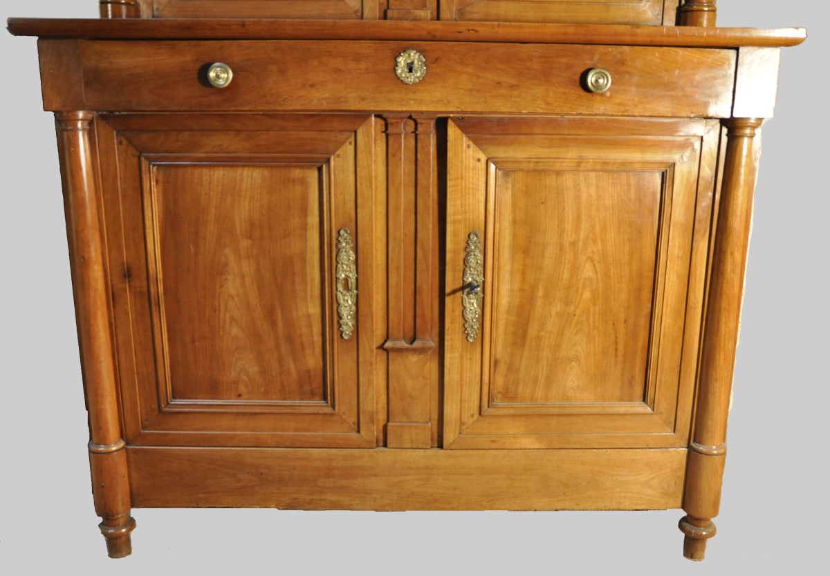 BUFFET DEUX-CORPS en merisier teinté et mouluré. Il ouvre par quatre vantaux et un tiroir en ceinture. Les montants en demi-colonne et les dormants ornés de doubles pilastres. Garniture de bronzes ciselés et dorés : entrées de serrures et poignées de tirage.