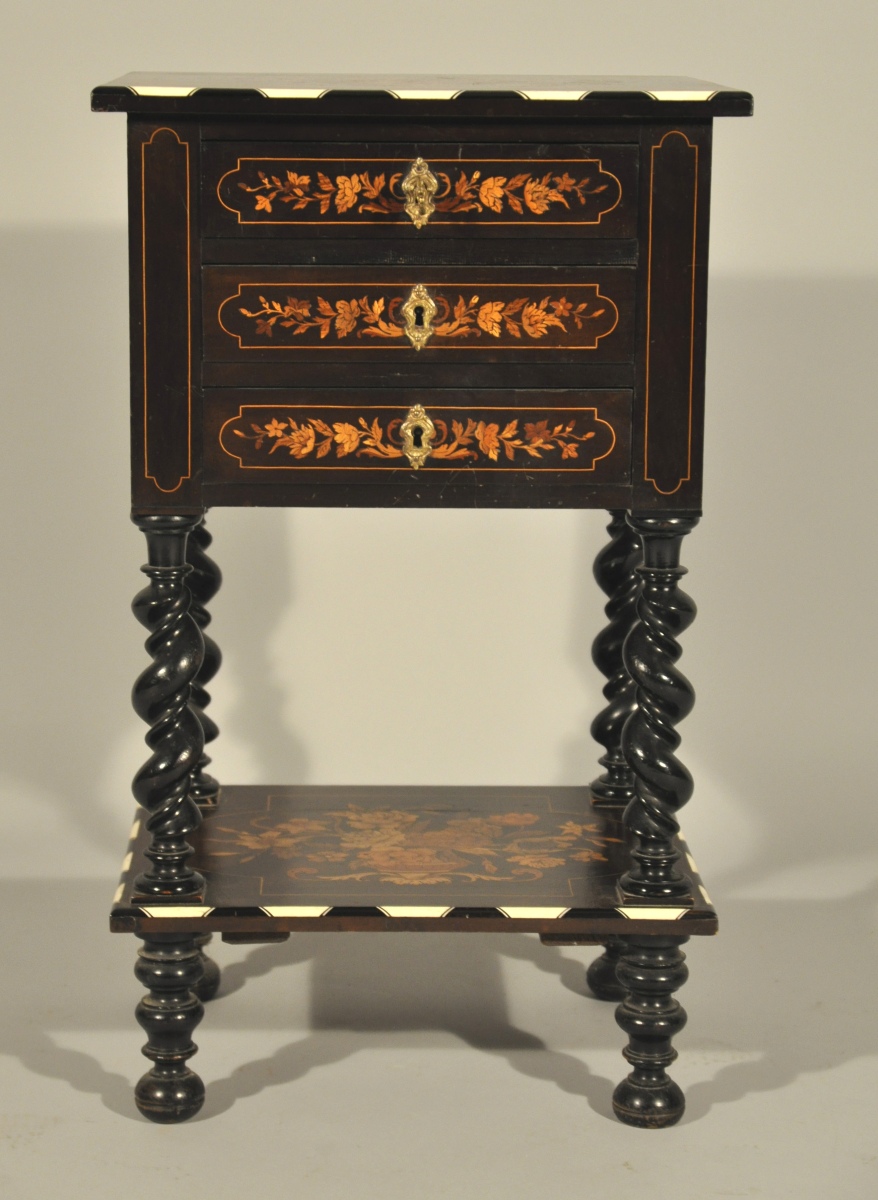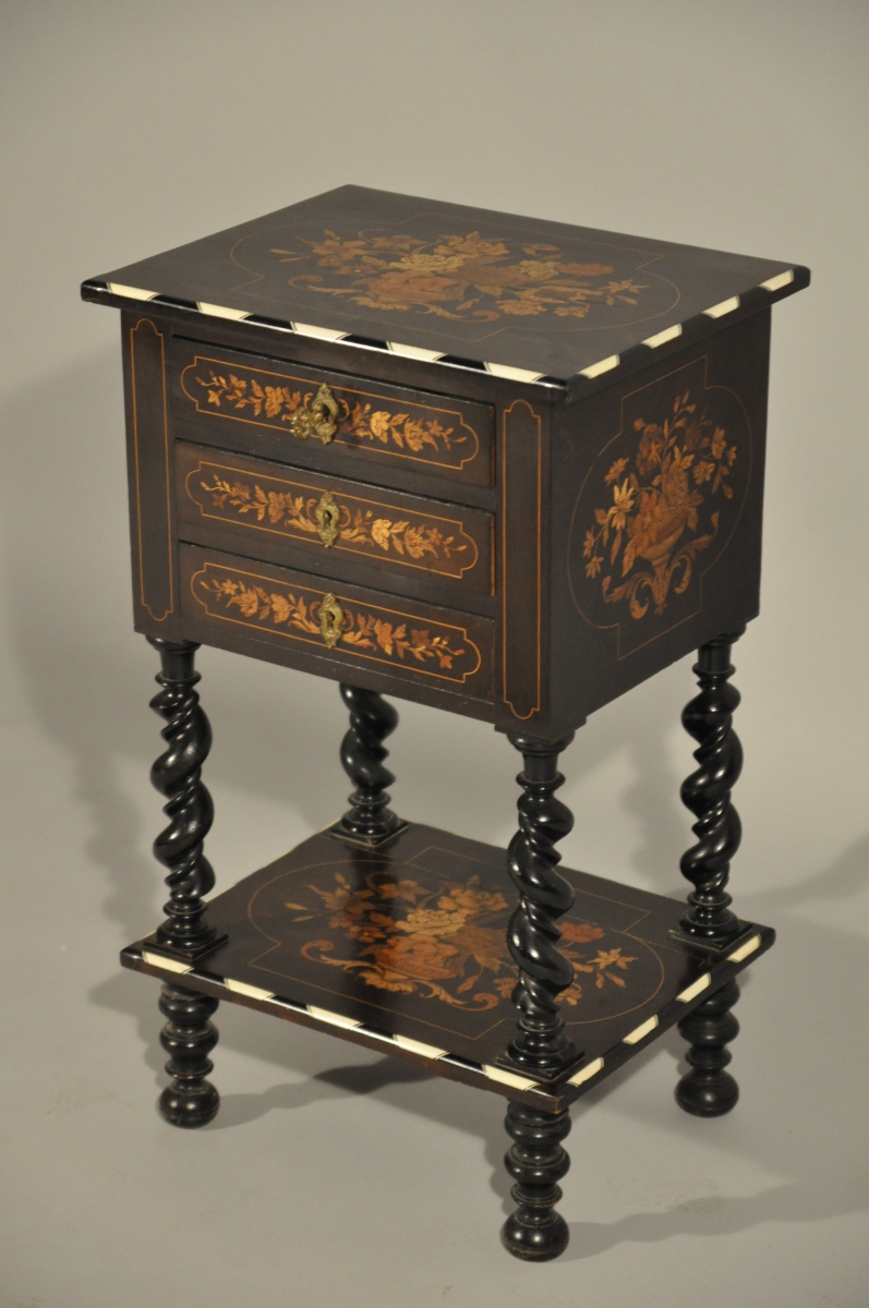 CHEVET "BOULLE" en bois noirci à décor marquetté ouvrant à trois tiroirs. Il repose sur quatre pieds tournés réunis par une tablette d'entrejambe. Le plateau, la tablette d'entrejambe, les tiroirs en façade et les côtés latéraux richement marqueté à la façon de Boulle de vases de fleurs, de rinceaux et bouquets dans un encadrement alternant baguettes d'ivoire (?) et d'ébène (?). Entrées de serrures en bronze doré.