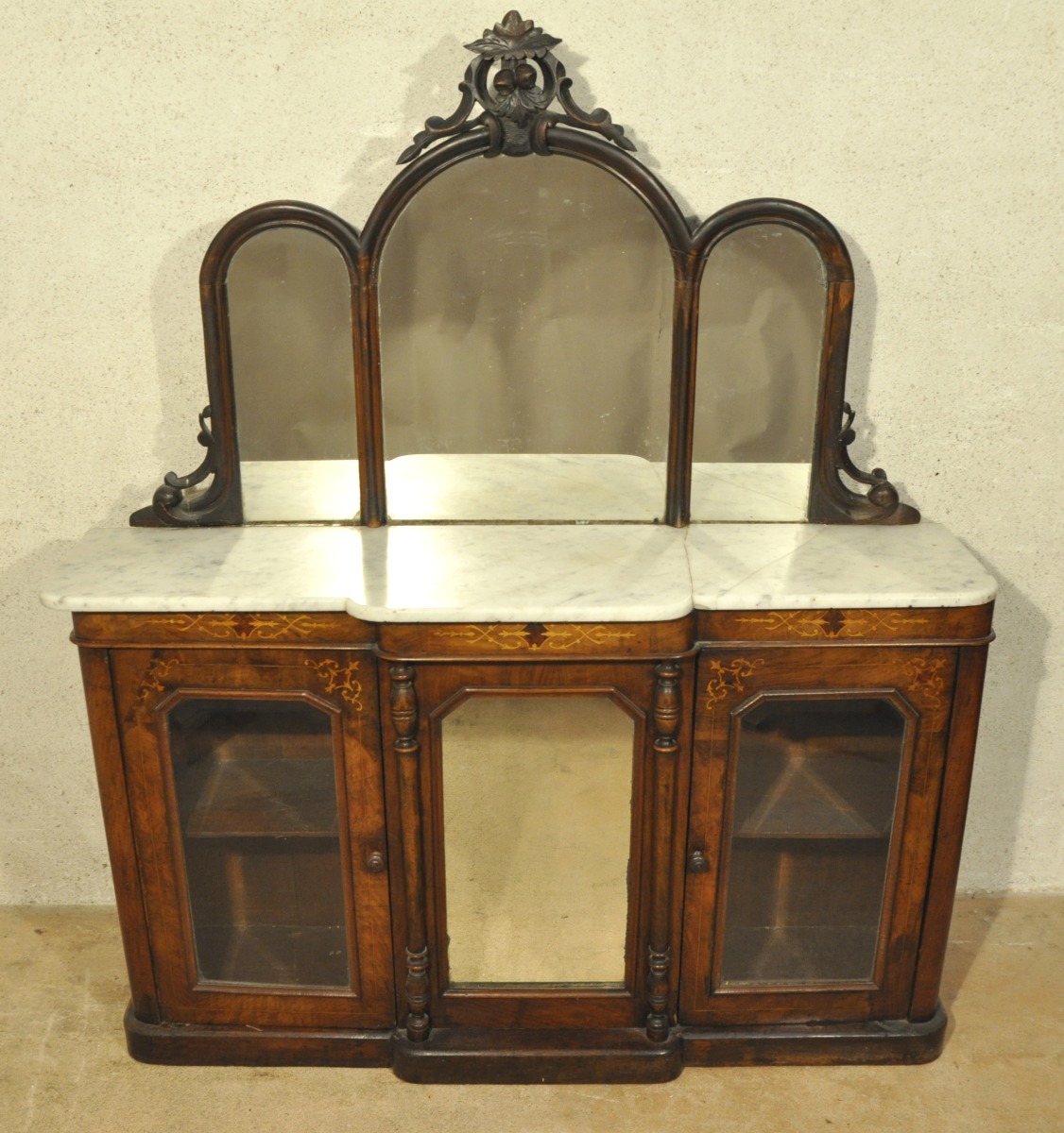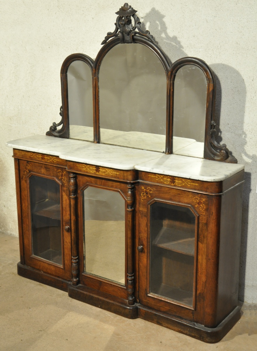 COIFFEUSE à ressaut central en noyer et placage de noyer mouluré et marqueterie de bois clair. Elle ouvre à deux vantaux vitrés encadrant un miroir, lui-même accosté par deux colonnes détachées en bois tourné. Elle est sommée d'un miroir triple à décor sculpté et ajouré de rinceaux, fruits et feuillages. Dessus de marbre blanc.