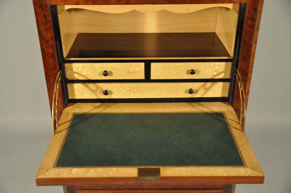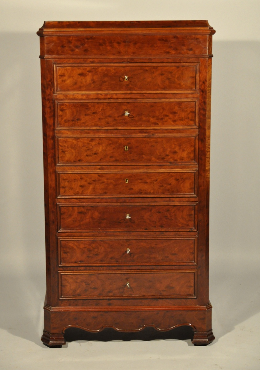 SECRÉTAIRE SEMAINIER en placage de bois de loupe mouluré. L'intérieur plaqué de bois clair. Il ouvre à quatre tiroirs et un abattant, simulant trois tiroirs, découvrant un casier et trois tiroirs. Écritoire foncé de cuir vert doré aux petits fers. Montants à pans coupés. Traverse mouvementée.