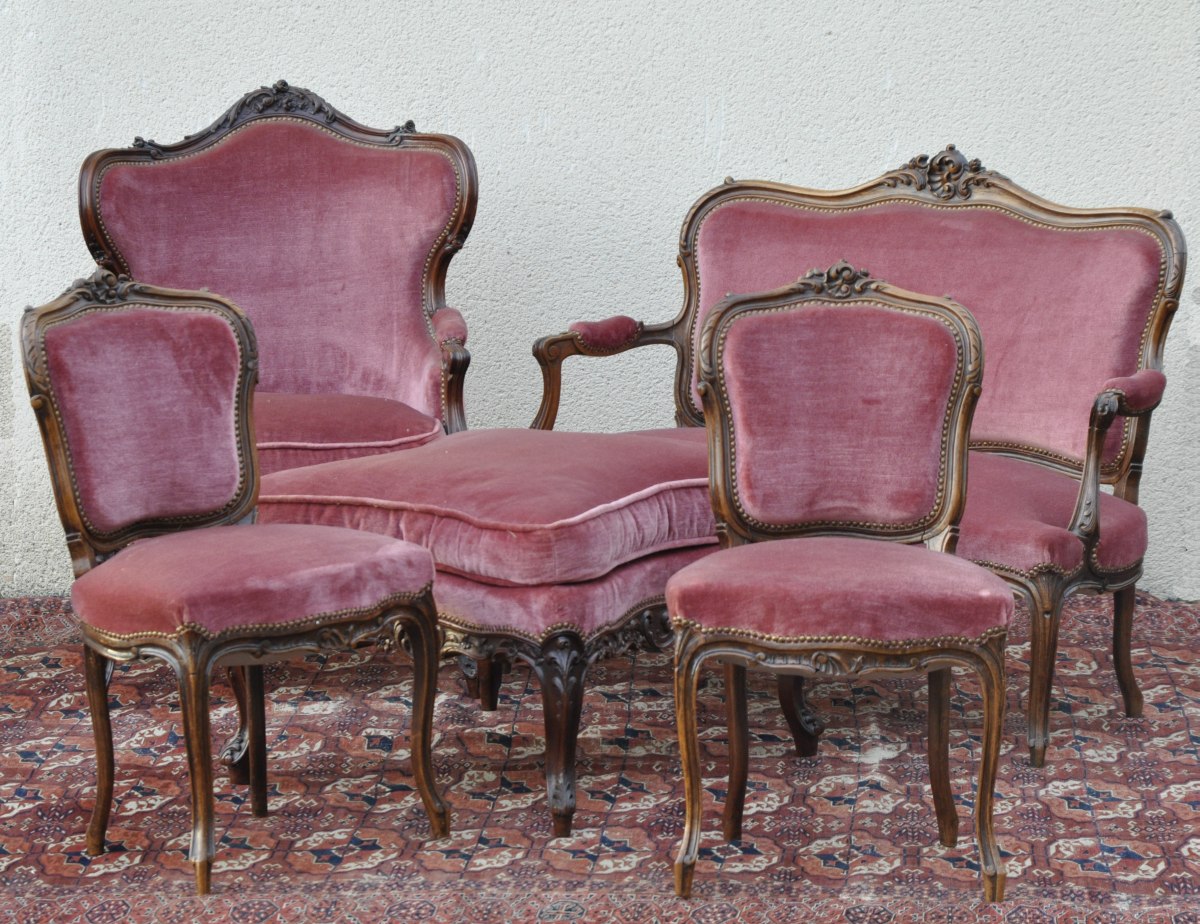 SALON en noyer mouluré et sculpté de roses, rinceaux, coquilles...