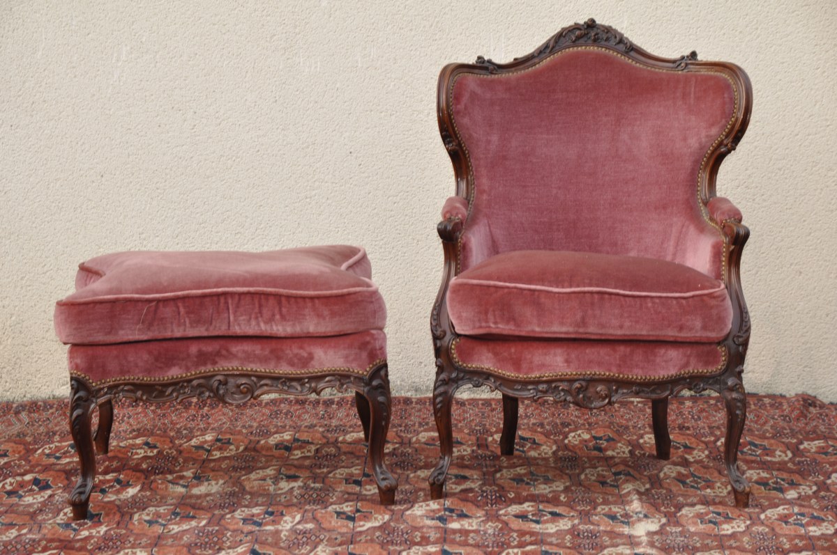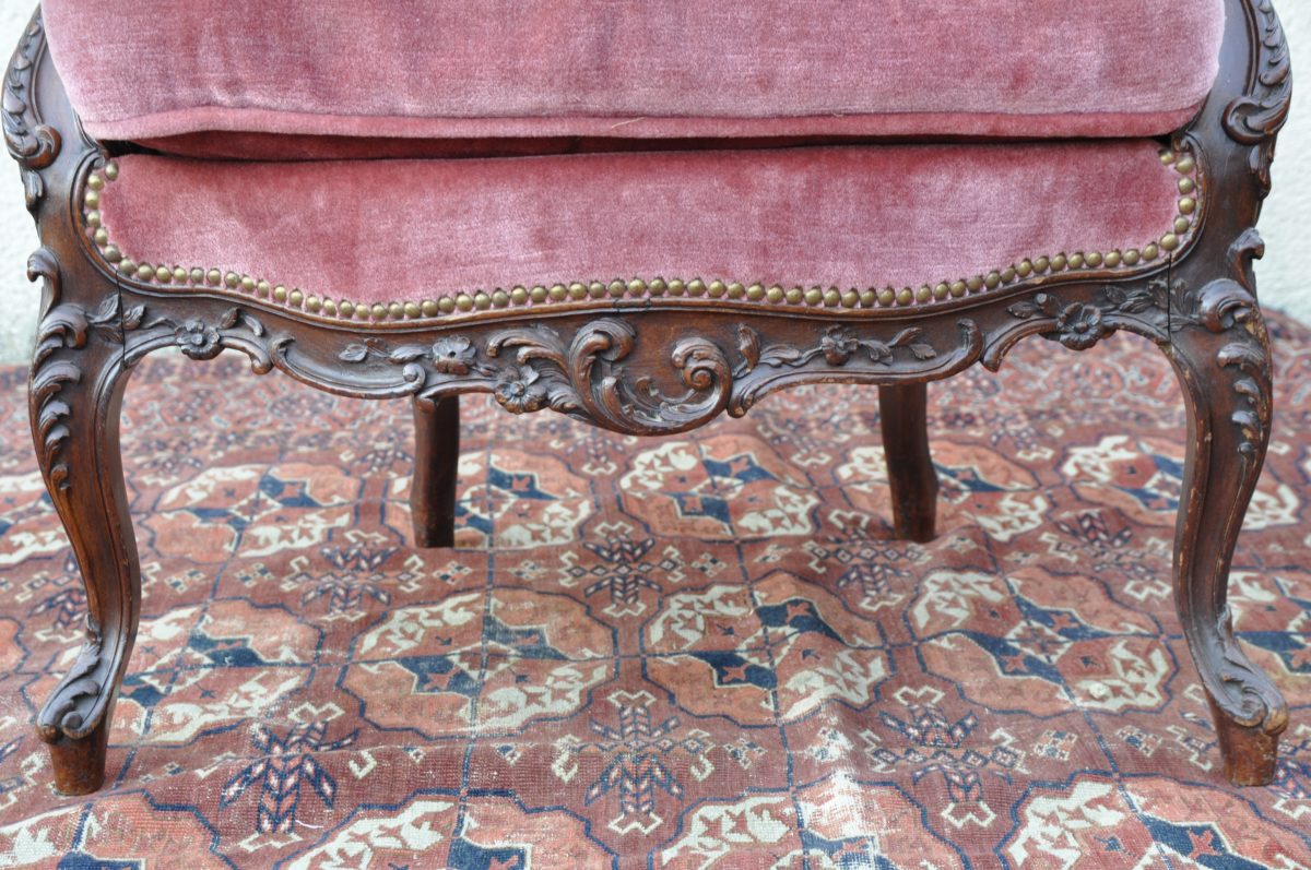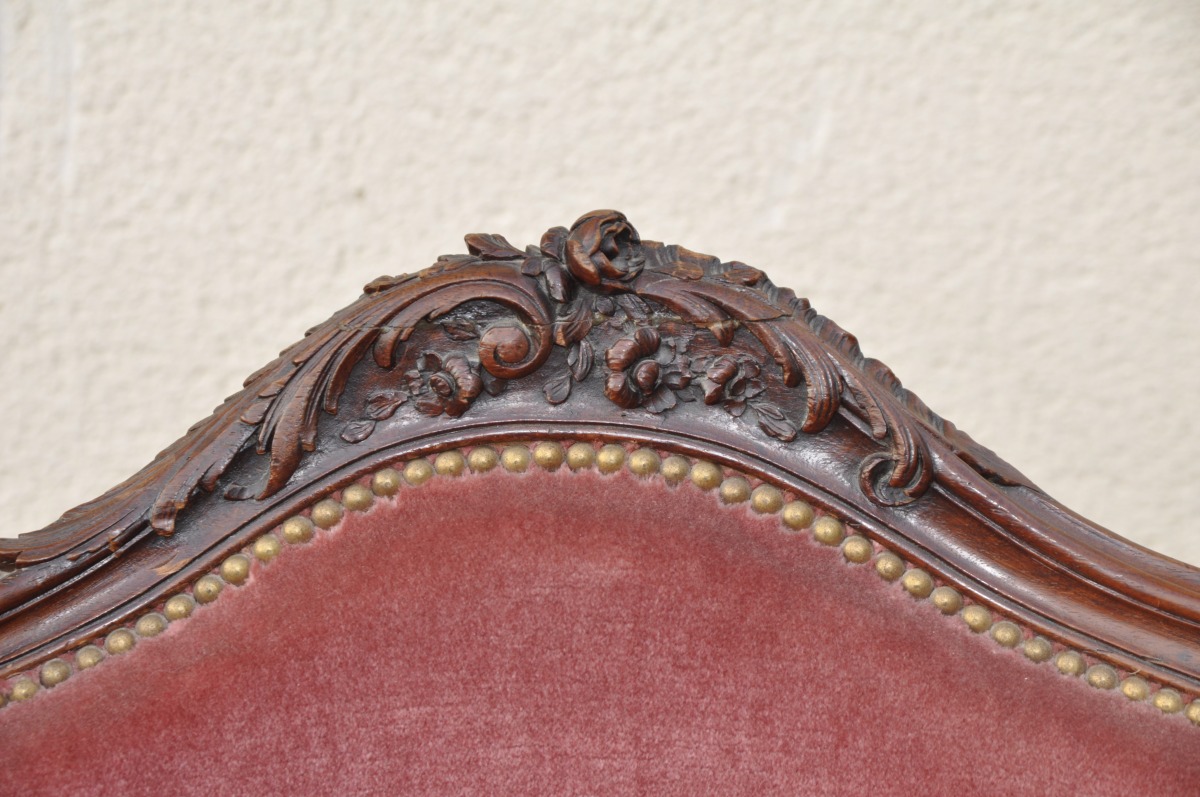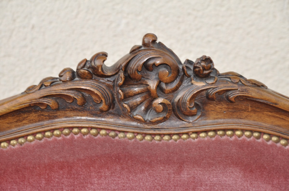 SALON en noyer mouluré et sculpté de roses, rinceaux, coquilles et feuillages stylisés. Pieds cambrés terminés par un enroulement.