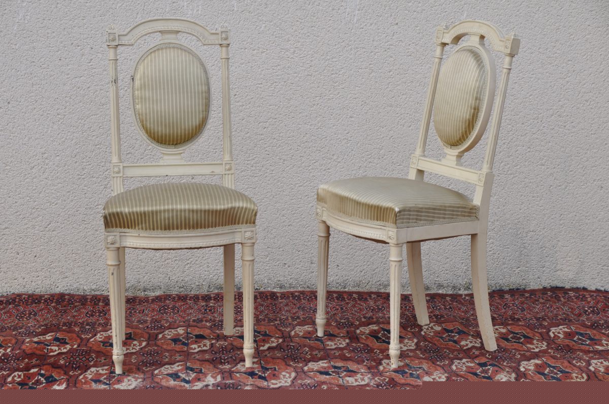 PAIRE DE CHAISES en bois mouluré, sculpté et relaqué crème. Décor de frises de feuilles d'eau, fleurons et cannelures. Pieds antérieurs cannelés et pieds postérieurs sabres. Dossier de forme ovale flanqué de colonnes cannelées.