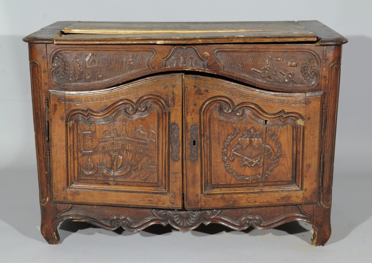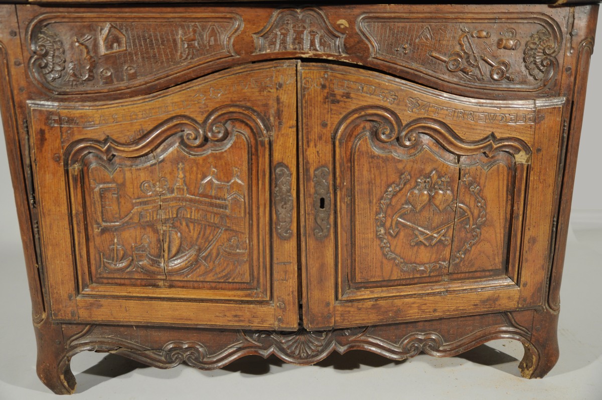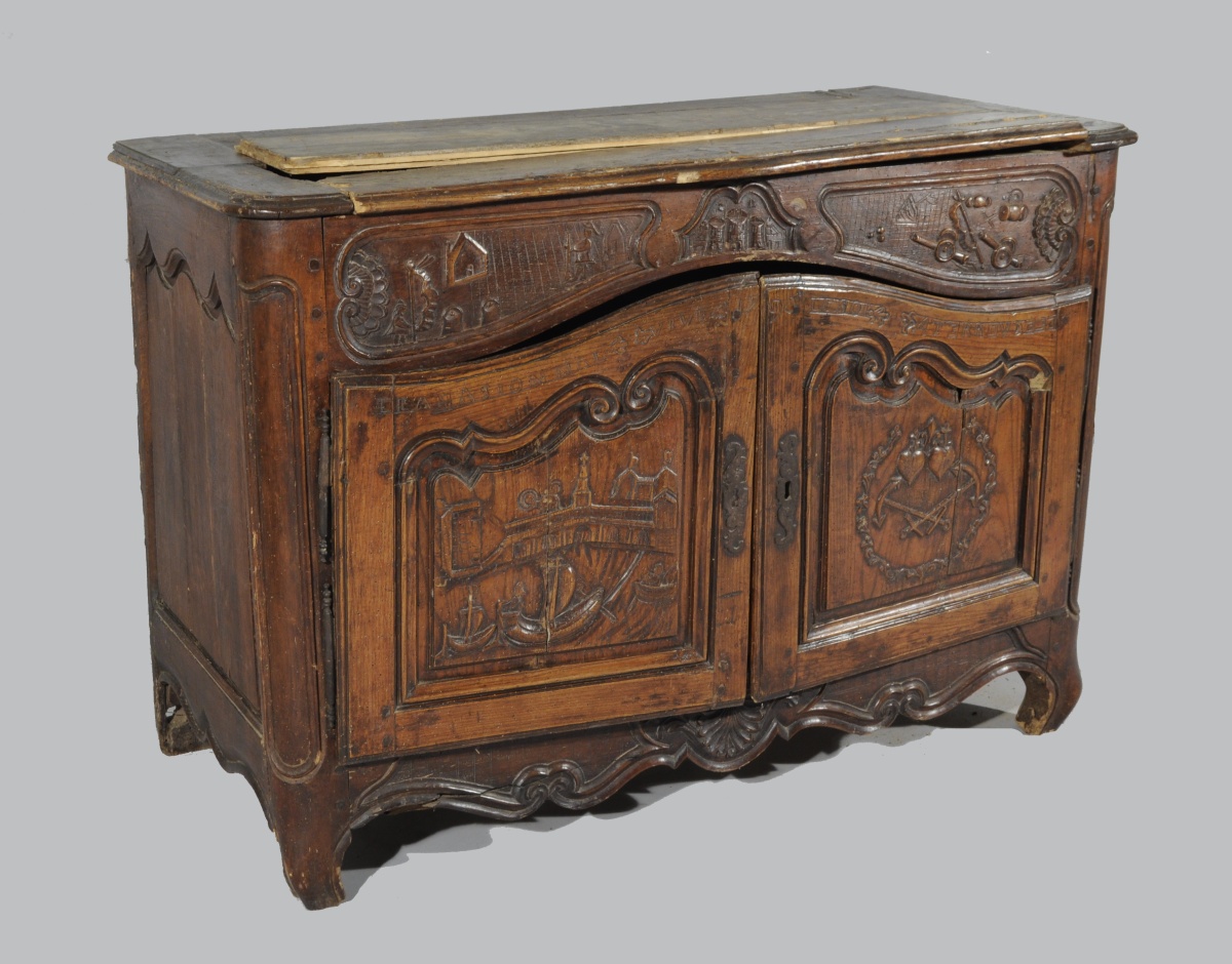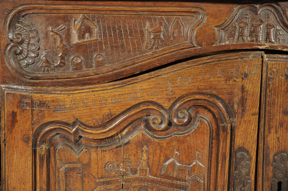 BUFFET-BAS rustique en bois naturel mouluré et sculpté ouvrant en façade par deux vantaux. Traverse haute chantournée à décor de combattants, château et canons dans trois réserves. Les vantaux reçoivent un décor de navires, épées croisées, cœurs et rinceaux sommés de l'inscription " LANASIONNAL / VIVE LE ROI / 1790 / ATERREVCELE ( ?) ". Traverse basse chantournée à décor de coquille, feuillages et volutes affrontées. Pieds antérieurs cambrés, pieds postérieurs droits (antés).