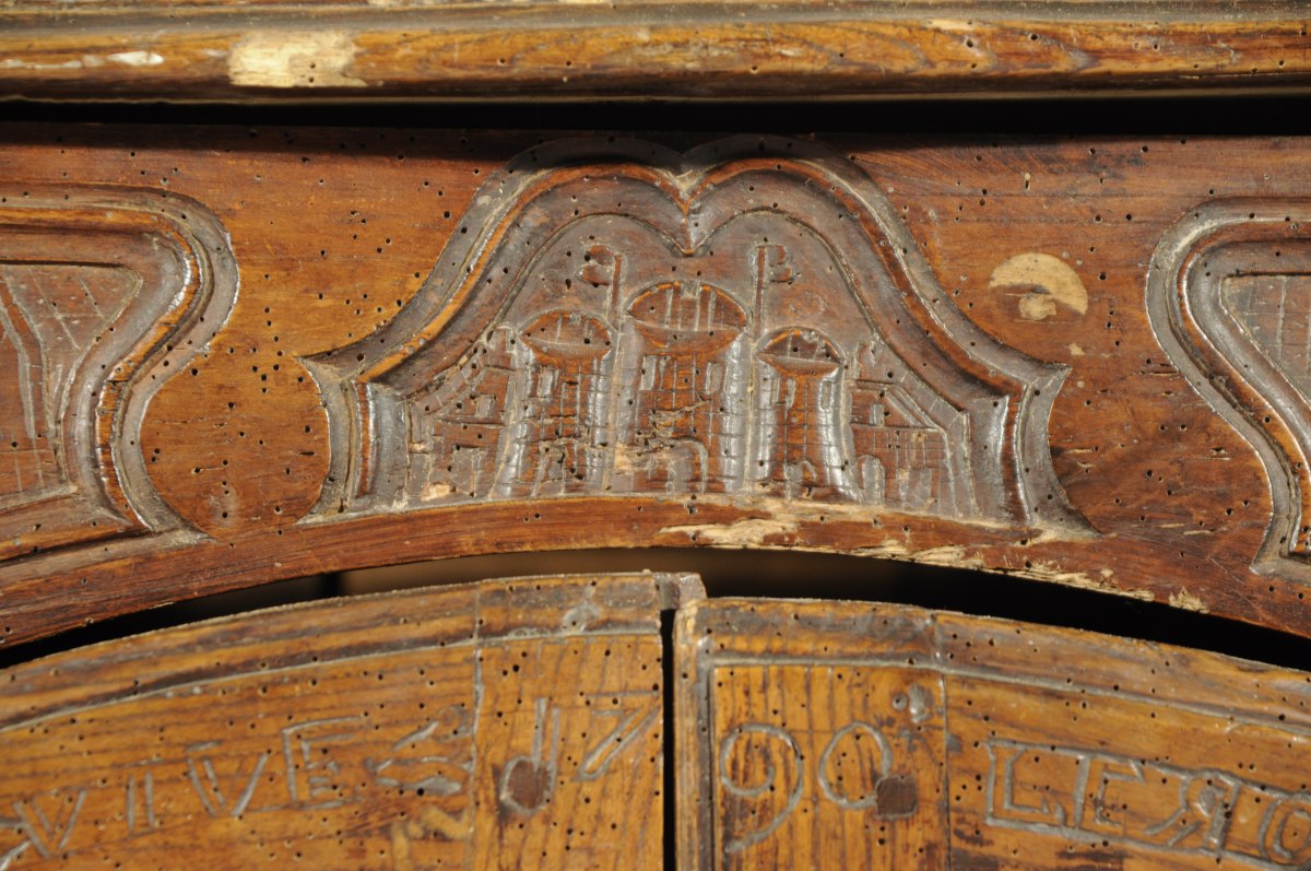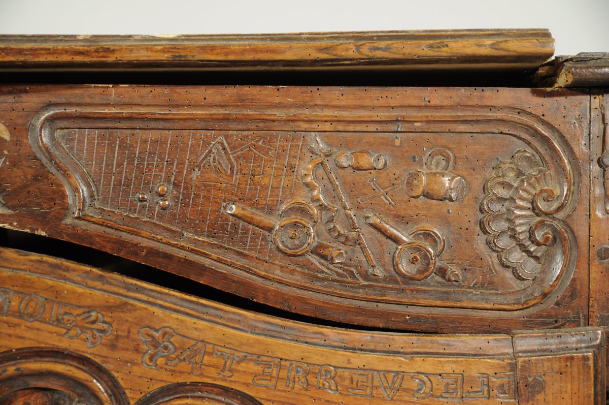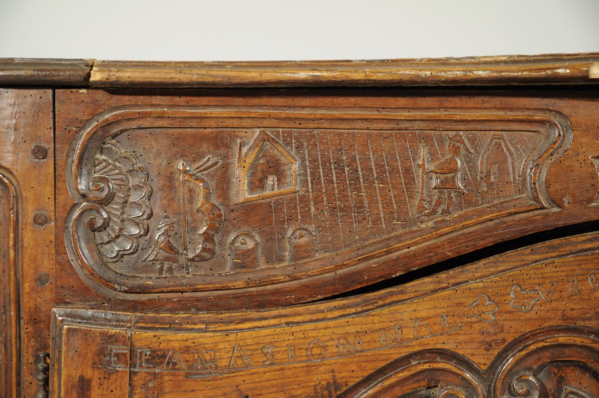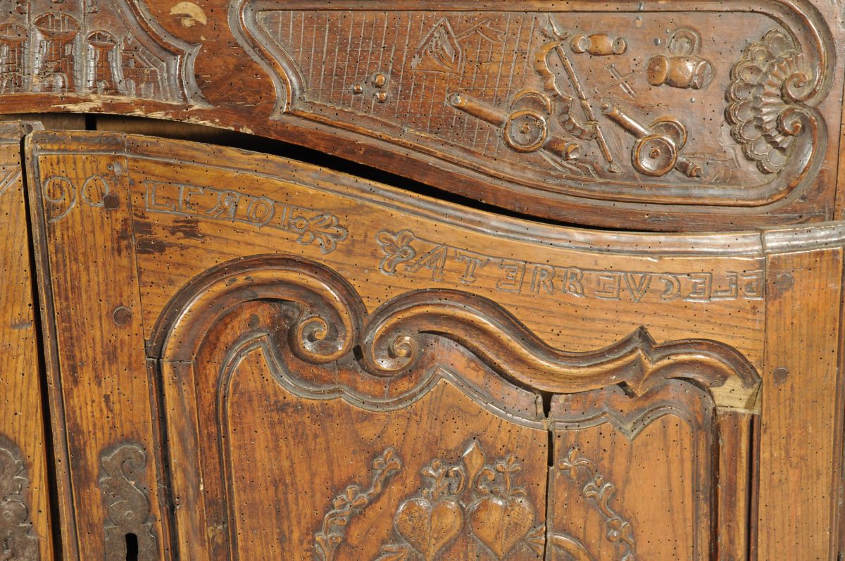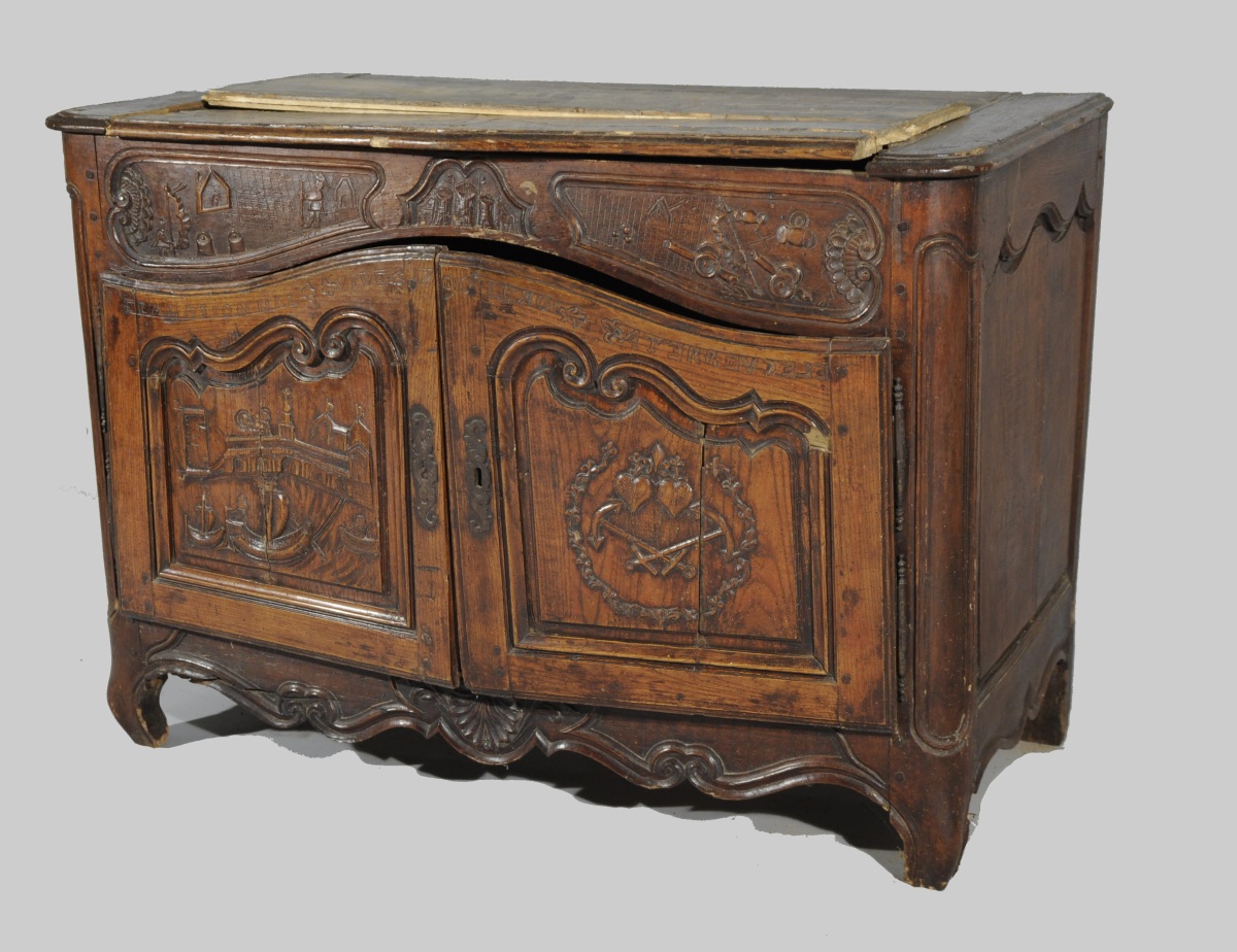 BUFFET-BAS rustique en bois naturel mouluré et sculpté ouvrant en façade par deux vantaux. Traverse haute chantournée à décor de combattants, château et canons dans trois réserves. Les vantaux reçoivent un décor de navires, épées croisées, cœurs et rinceaux sommés de l'inscription " LANASIONNAL / VIVE LE ROI / 1790 / ATERREVCELE ( ?) ". Traverse basse chantournée à décor de coquille, feuillages et volutes affrontées. Pieds antérieurs cambrés, pieds postérieurs droits (antés).