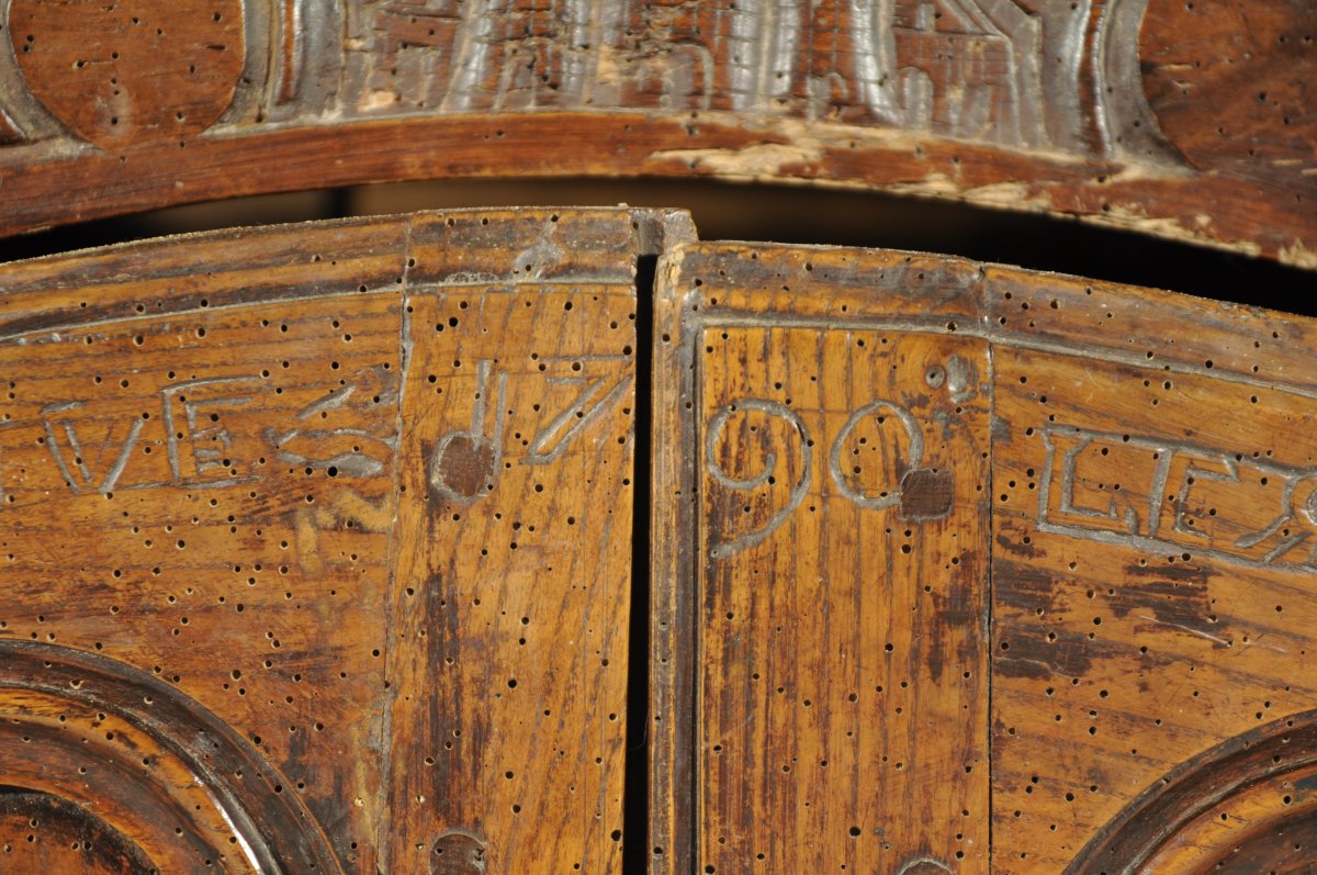 Haut, 89, Larg. 122,5, Prof. 63 cm. (l'inscription postérieure ?, accidents, manques, en l'état)