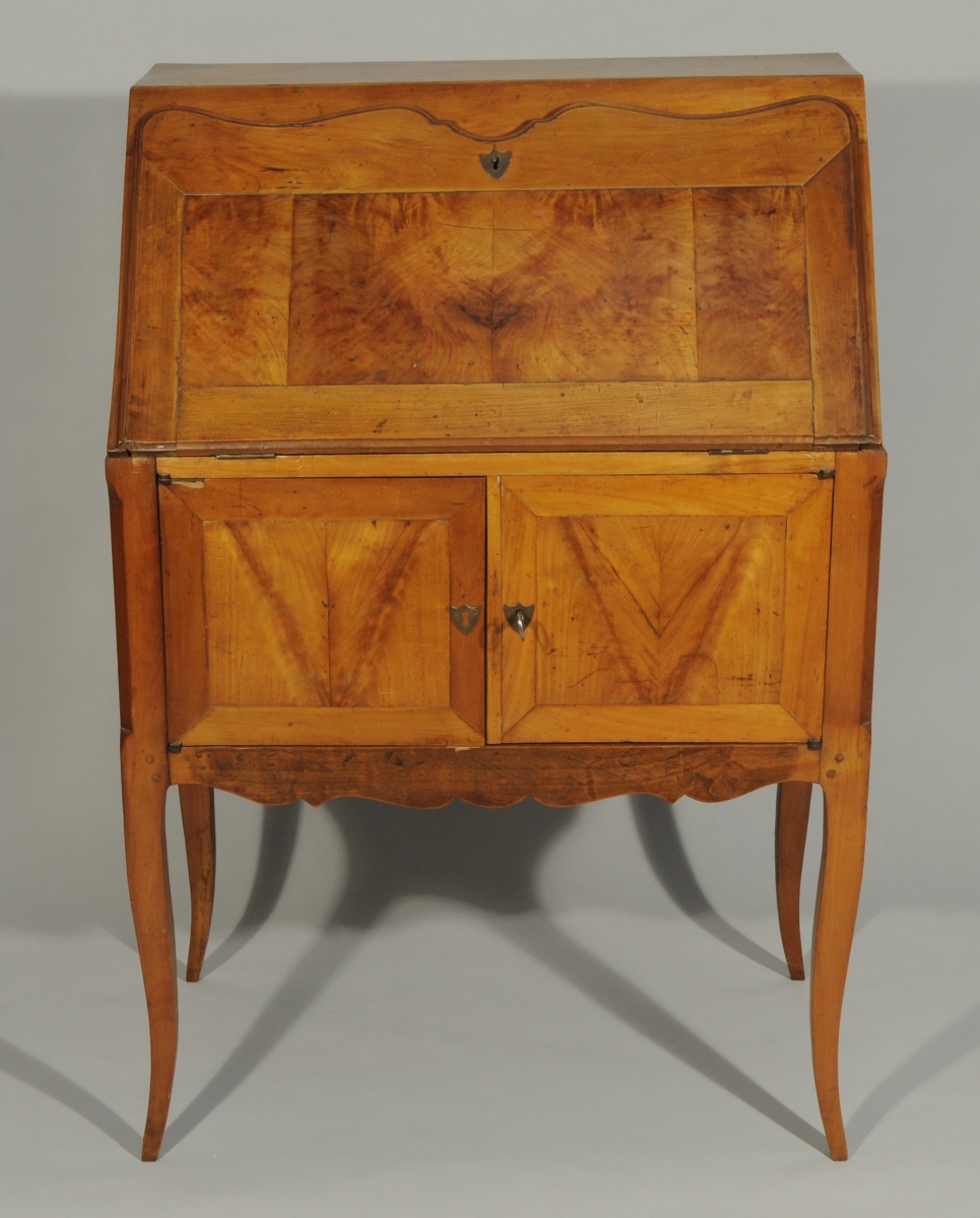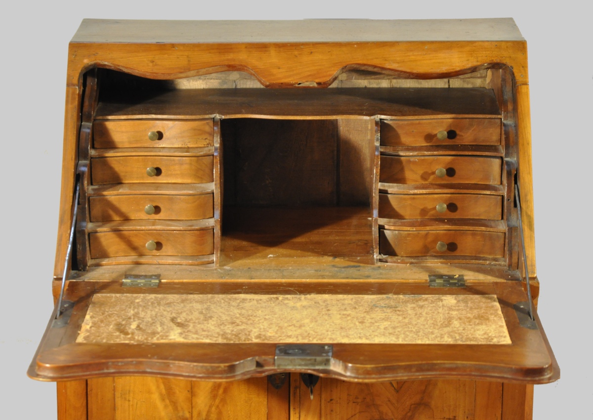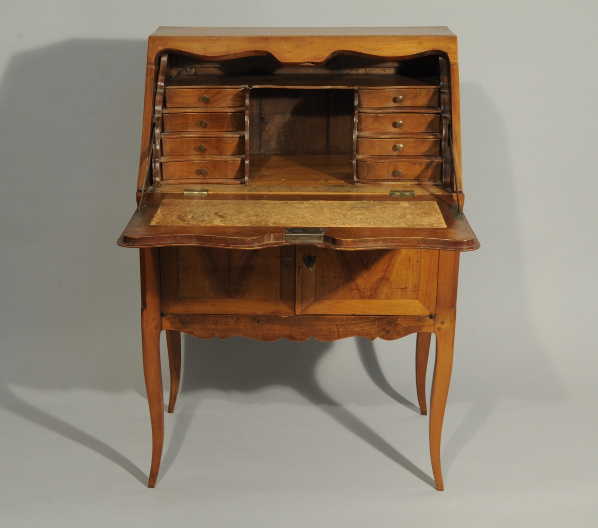 PETIT SECRÉTAIRE de PENTE en bois fruitier ouvrant par deux vantaux et un abattant découvrant une écritoire gainée de cuir, deux casiers et un gradin ouvrant à huit tiroirs. Montants à pans coupés. Traverse basse mouvementée. Pieds cambrés.