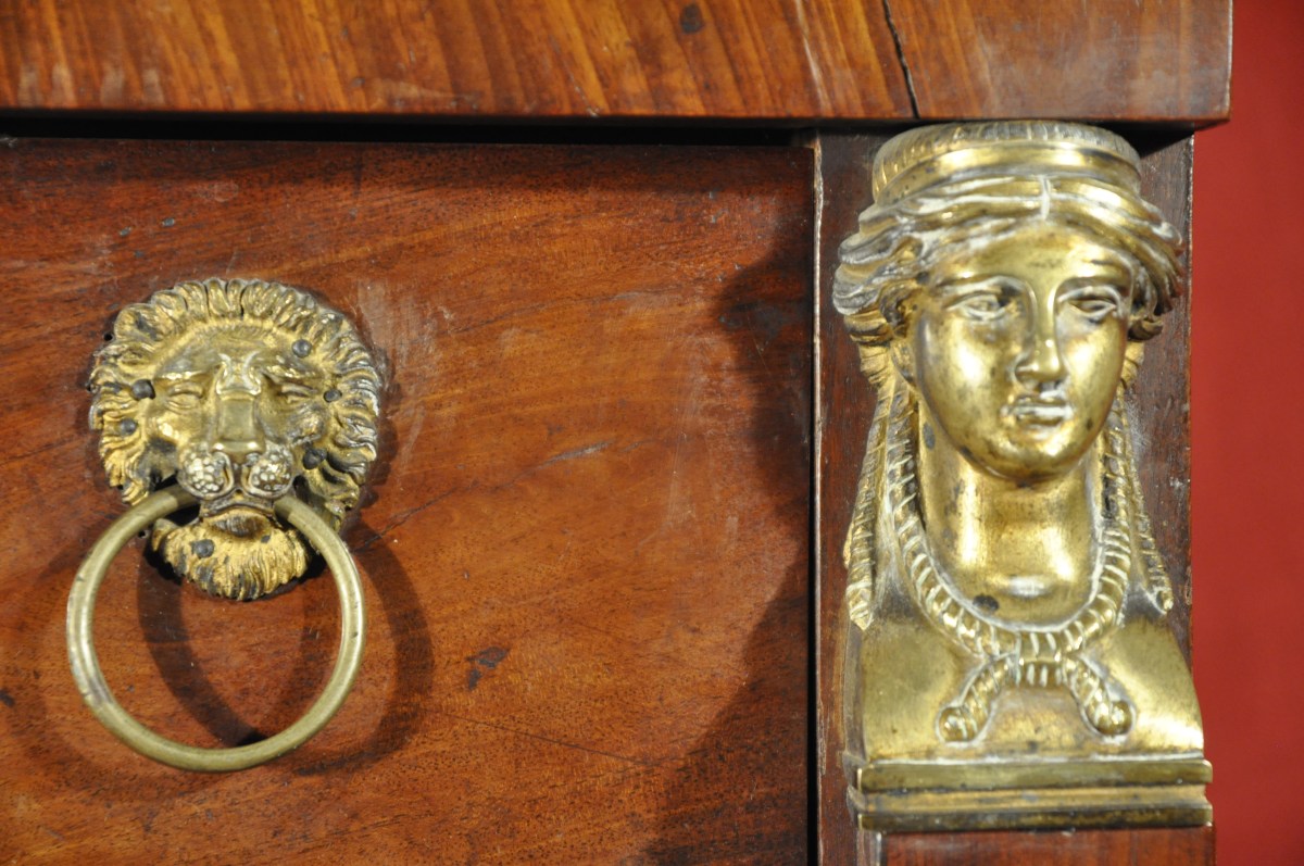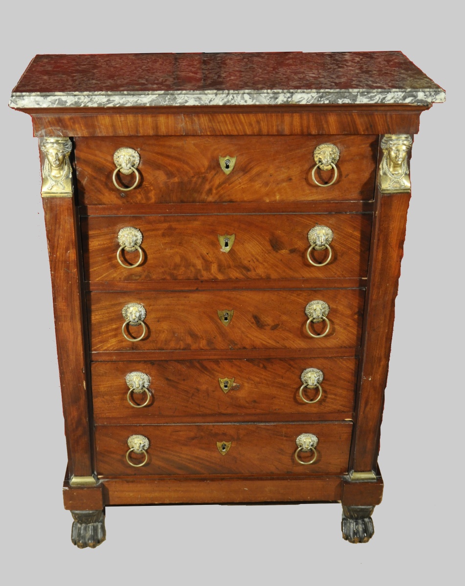 CHIFFONIER en acajou et placage d'acajou ouvrant en façade par cinq tiroirs. Riche ornementation de bronzes ciselés et dorés tels que têtes de caryatides, poignées de tirage à tête de lion. Pieds antérieurs à pattes de lions en bois noirci. Serrures à trèfle. Dessus de marbre gris Sainte Anne.