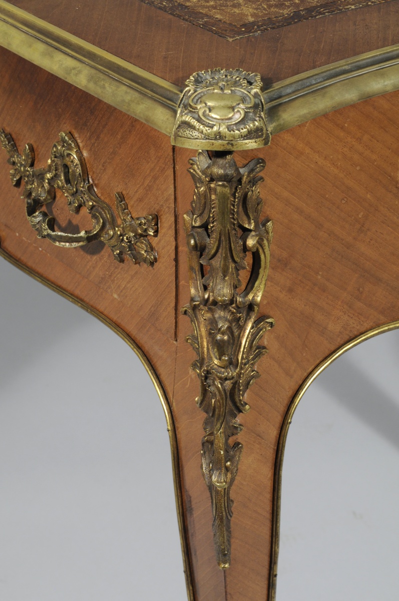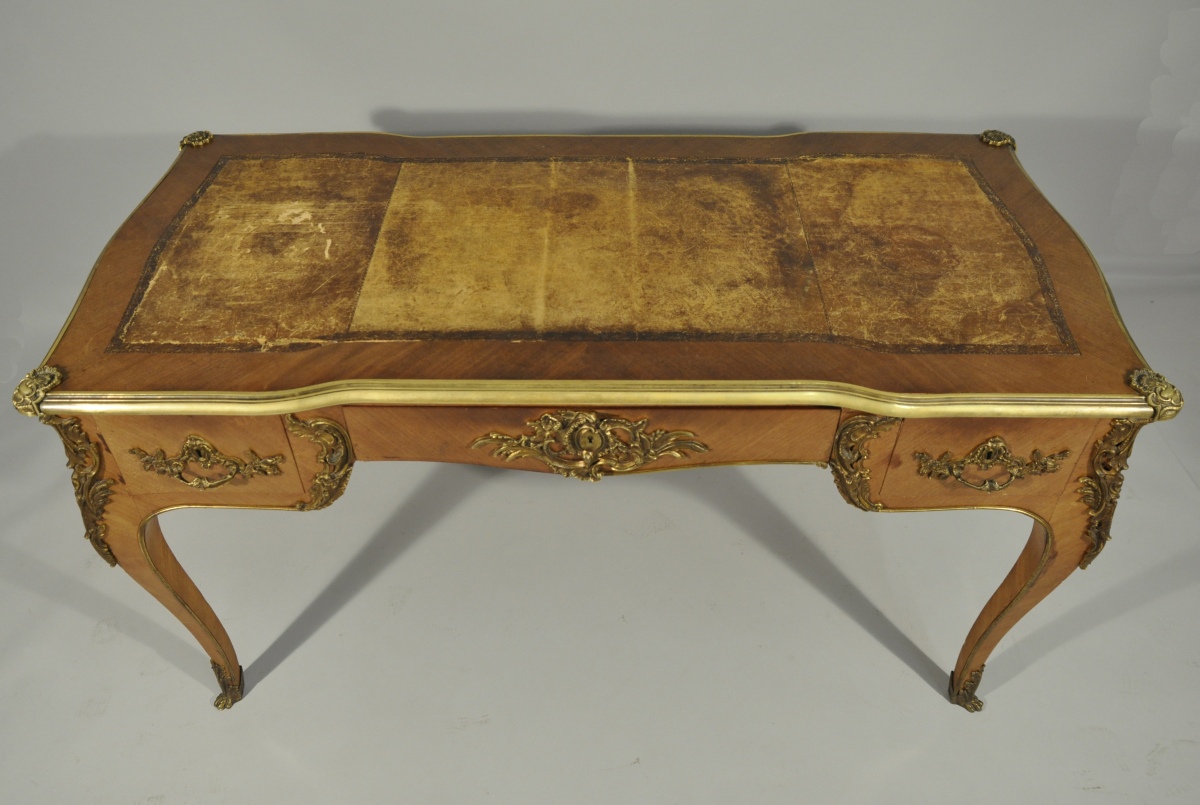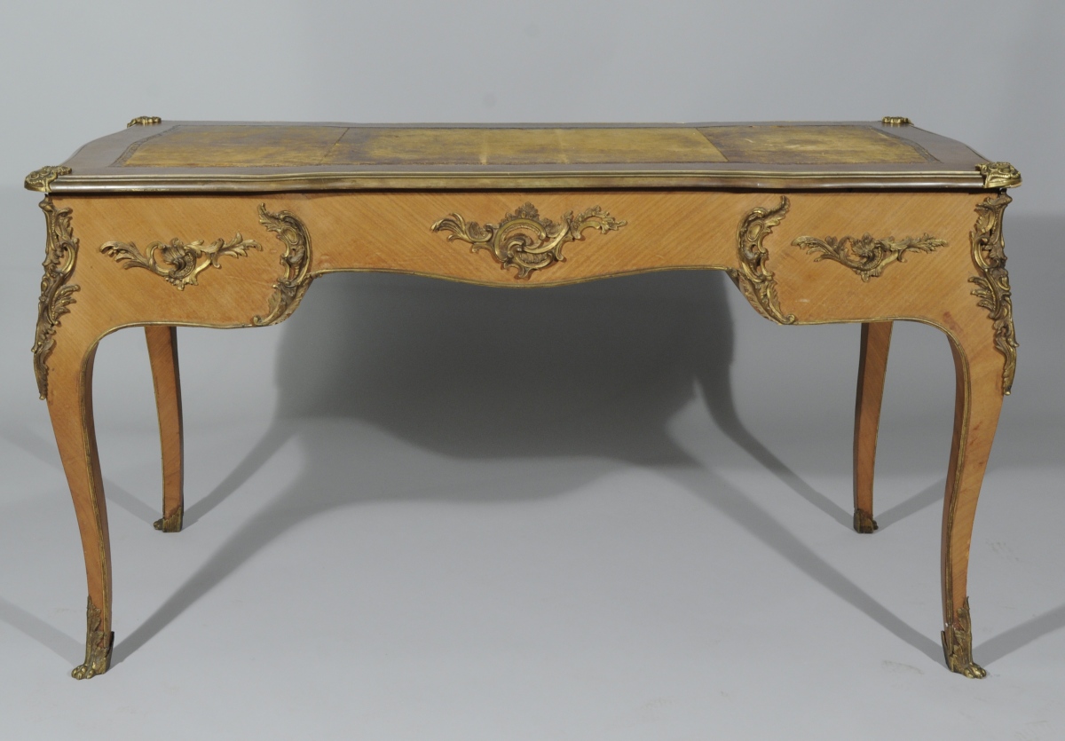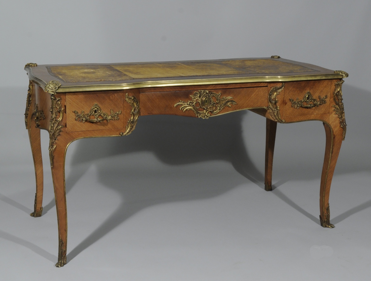 BUREAU plat en bois de placage ouvrant par trois tiroirs en ceinture. Plateau mouvementé foncé d'un cuir fauve doré aux petits fers. Ceinture chantournée. Il repose sur quatre pieds cambrés. Ornementation de bronzes dorés de style Rocaille tels que : lingotière, chutes d'angle, poignées de tirage, entrées de serrure et sabots en griffe de lion.