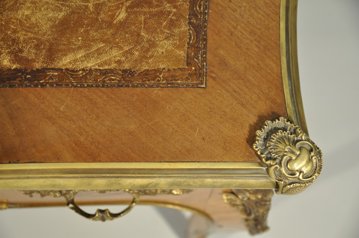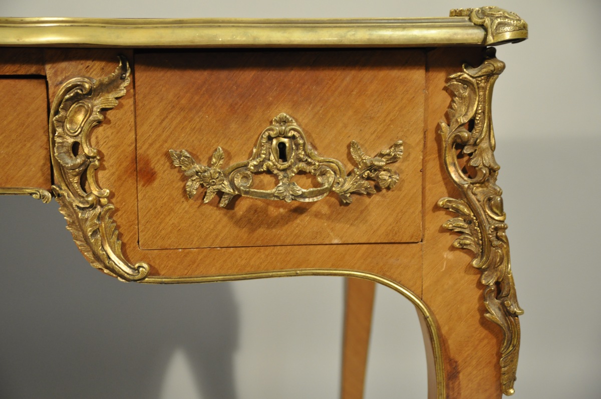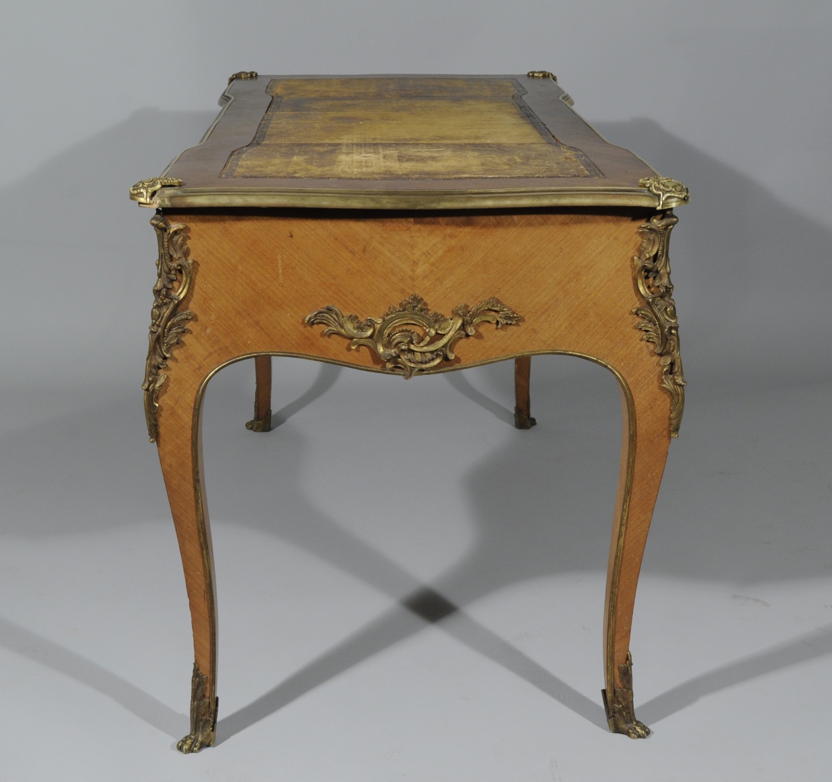 BUREAU plat en bois de placage ouvrant par trois tiroirs en ceinture. Plateau mouvementé foncé d'un cuir fauve doré aux petits fers. Ceinture chantournée. Il repose sur quatre pieds cambrés. Ornementation de bronzes dorés de style Rocaille tels que : lingotière, chutes d'angle, poignées de tirage, entrées de serrure et sabots en griffe de lion.