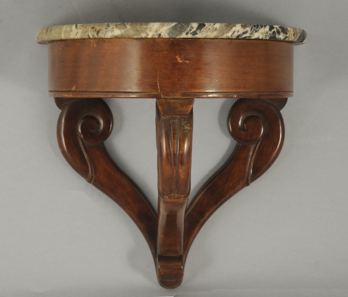 PAIRE de CONSOLES murales en bois mouluré, sculpté et teinté. Plateau en demi-lune. Reposent sur trois pieds en crosse. Dessus de marbre gris.