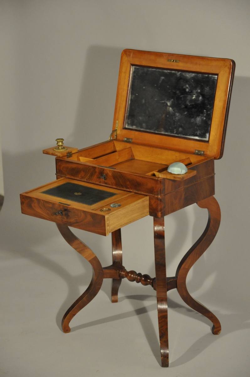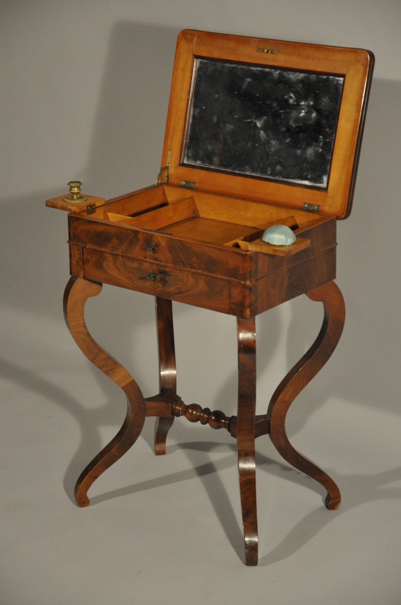 TABLE TRAVAILLEUSE en acajou et placage d'acajou. Elle ouvre à un abattant dissimulant un miroir, trois casiers, un bougeoir et un coussin à épingles, et un tiroir dissimulant une écritoire amovible foncée de cuir vert doré aux petits fers dissimulant un casier et deux godets.