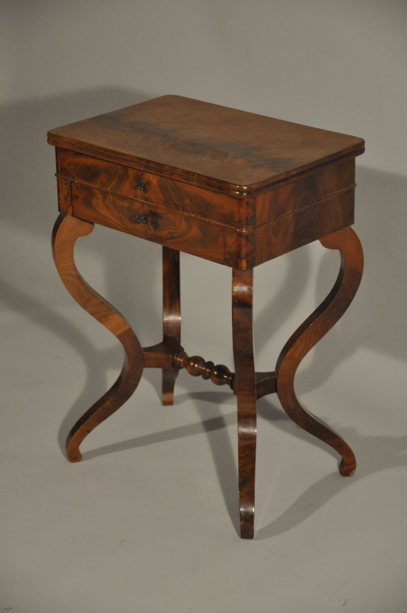 TABLE TRAVAILLEUSE en acajou et placage d'acajou. Elle ouvre à...