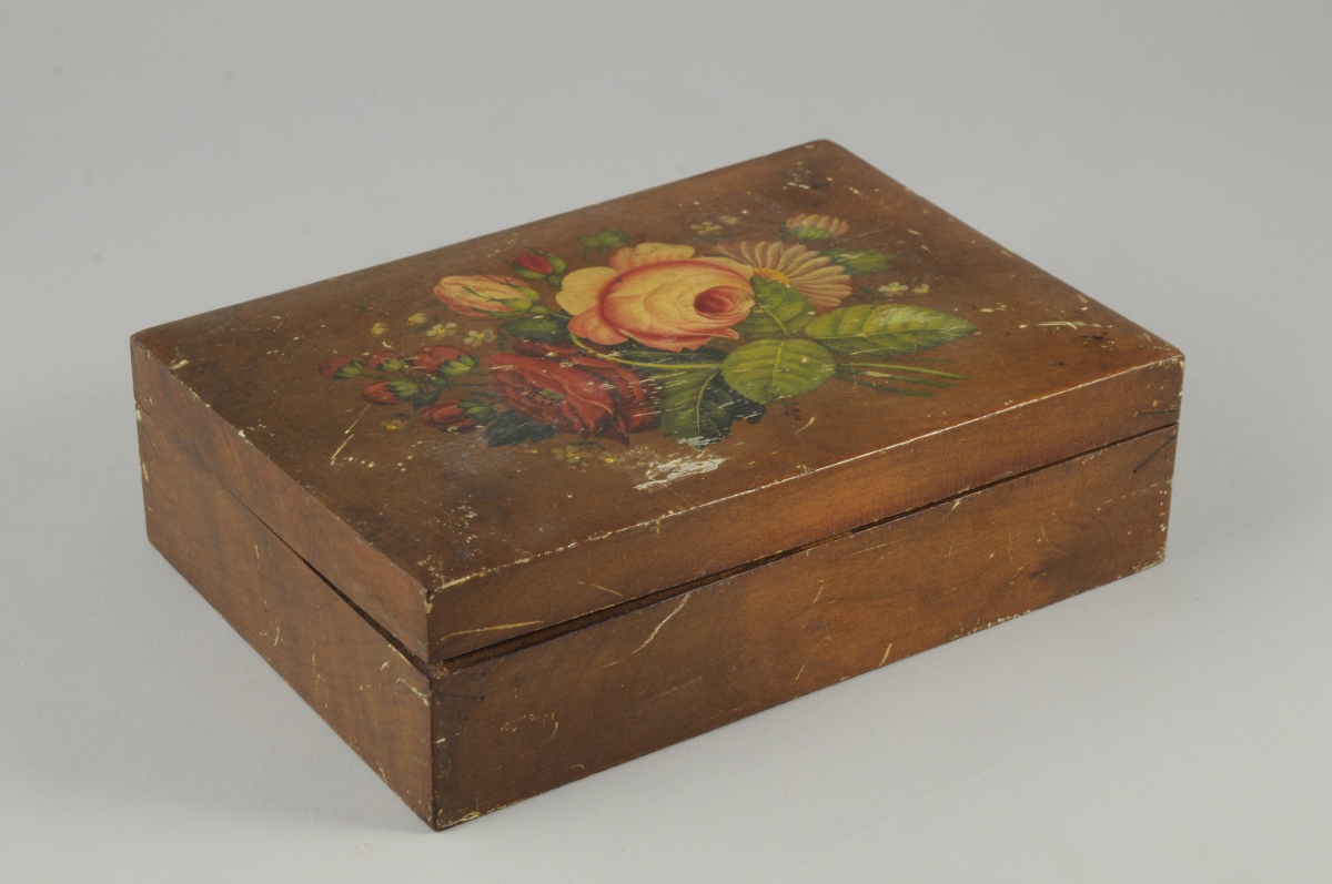 BOÎTE à OUVRAGE en bois à décor polychrome peint de bouquets de fleurs. L'intérieur compartimenté. Début XXème. Haut. 6, Larg. 20, Prof. 14 cm. (manques, usures)