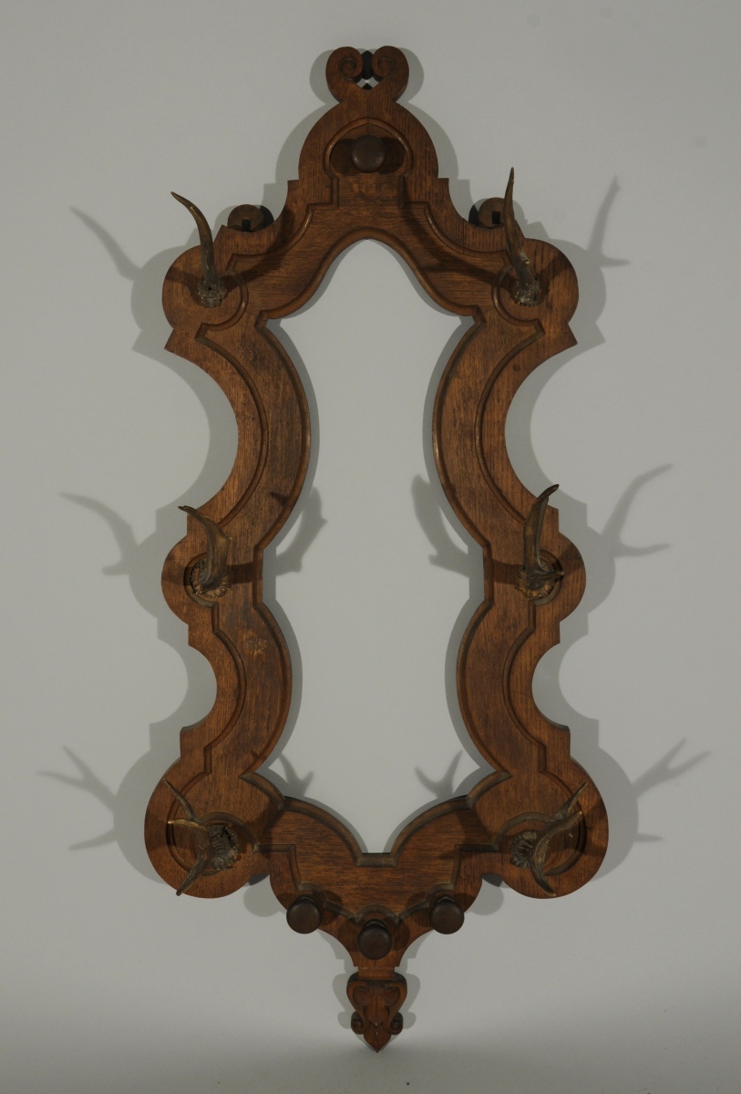PORTE-FUSILS de forme chantournée en chêne mouluré et sculpté de volutes affrontées et feuilles d'acanthe stylisées. Il reçoit trois paires de bois de brocart et quatres patères. XIXème. Haut. 108, Larg. 50, Prof. 22 cm.