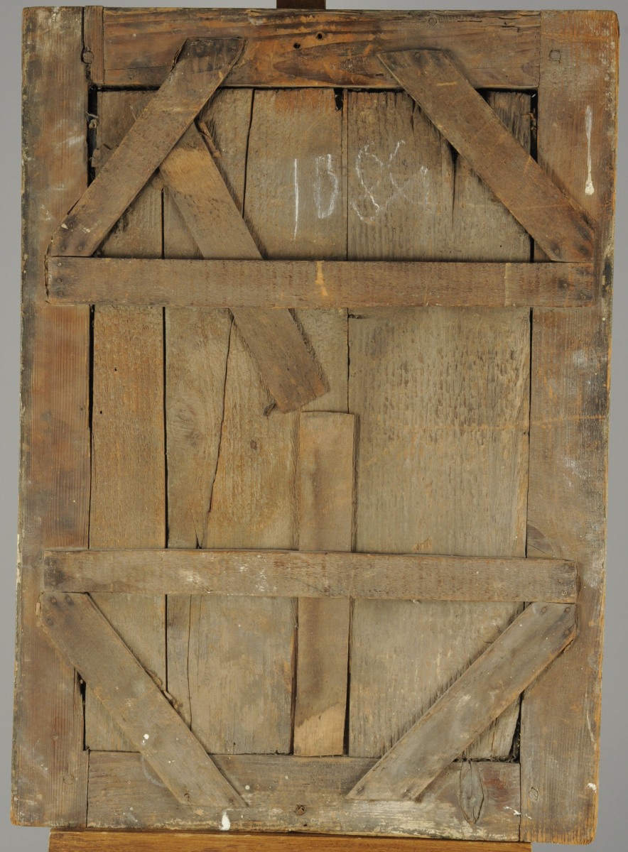MIROIR en bois sculpté et laqué vert et jaune. La glace peinte d'un oiseau exotique branché.