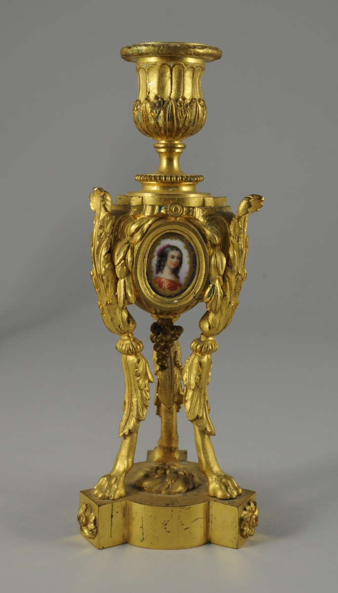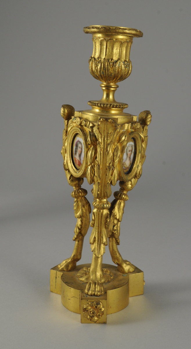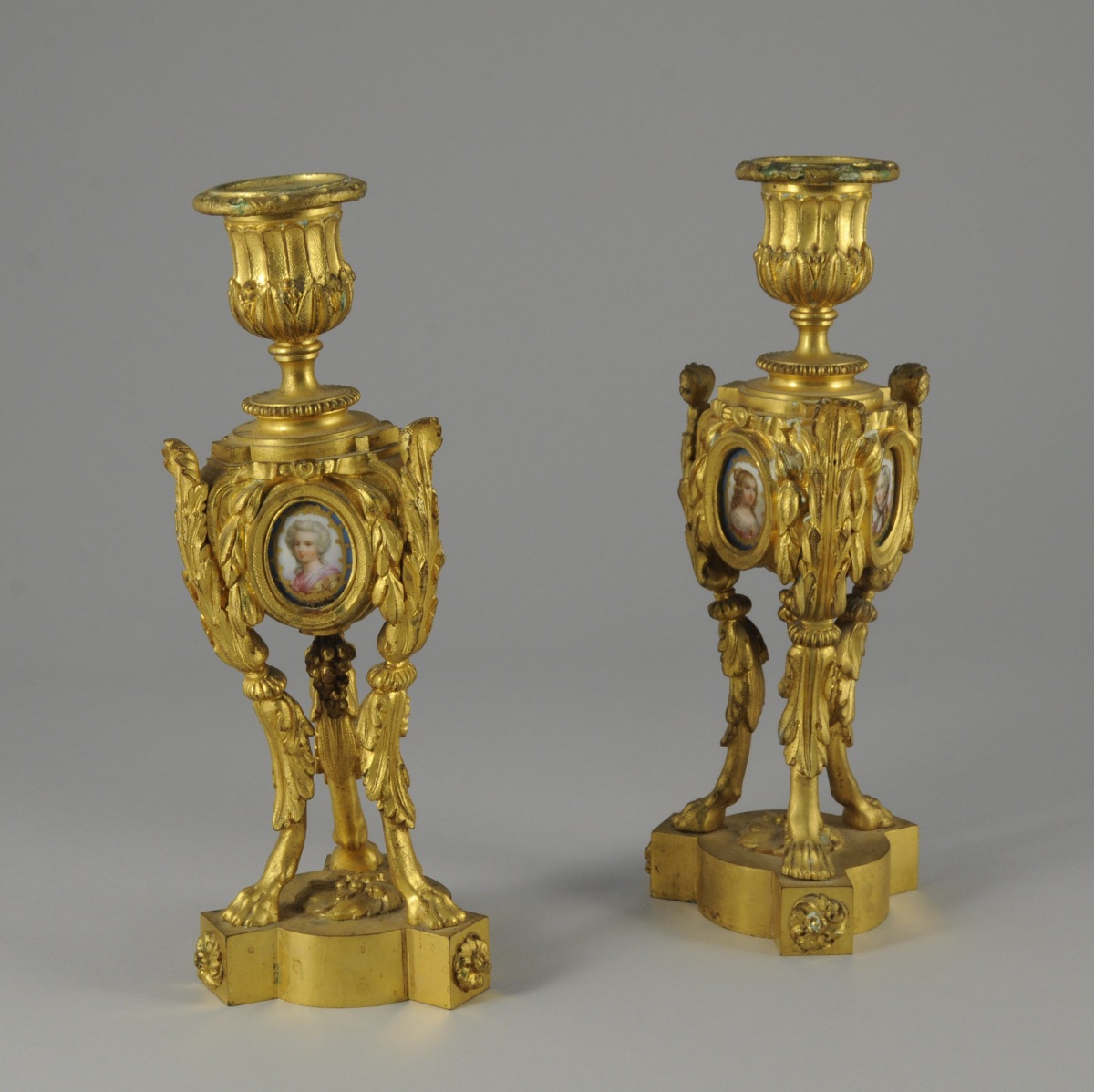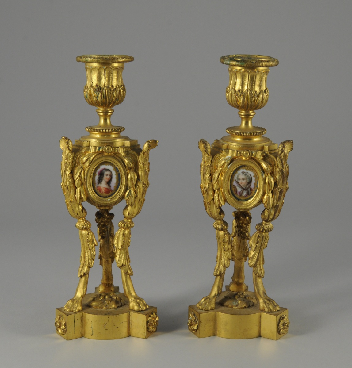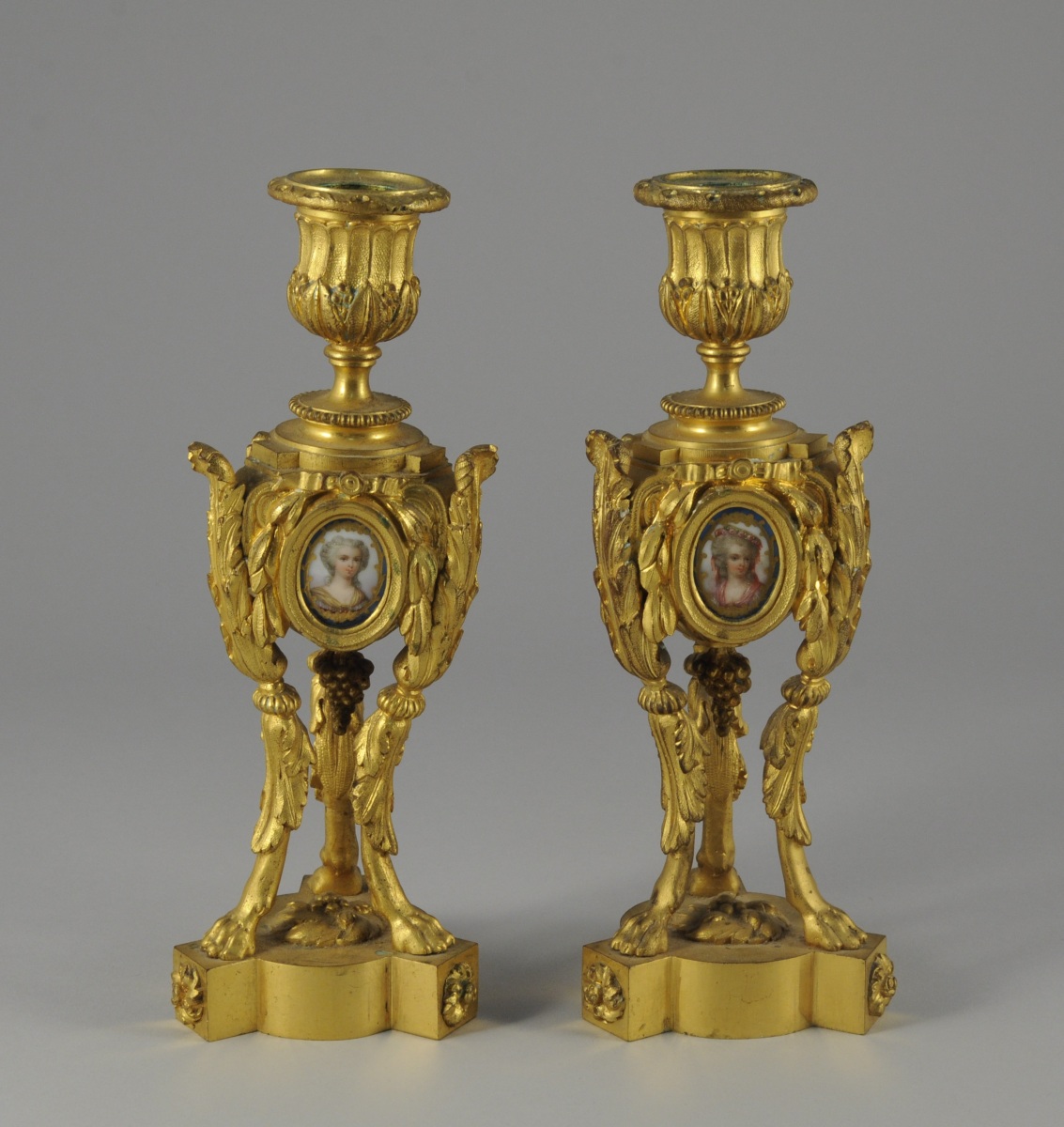 PAIRE de FLAMBEAUX en bronze doré. Le piètement tripode orné de feuillages se terminant en pattes de lion. Fût orné sur ses trois faces d'un médaillon de porcelaine ovale représentant un portrait de jeune fille encadré de feuillages, ruban et d'une grappe de raisin. Binets en forme de vase godronné et feuillagé.