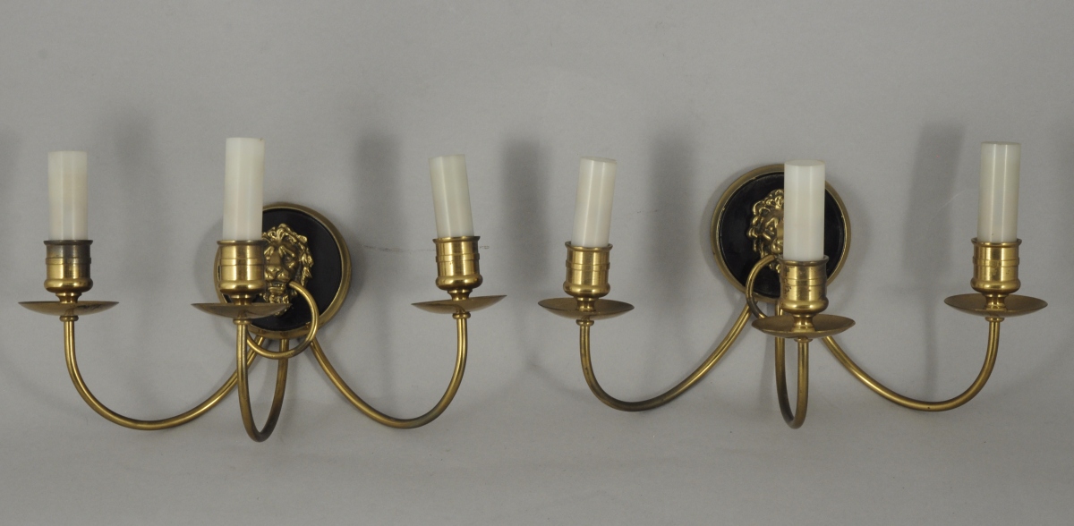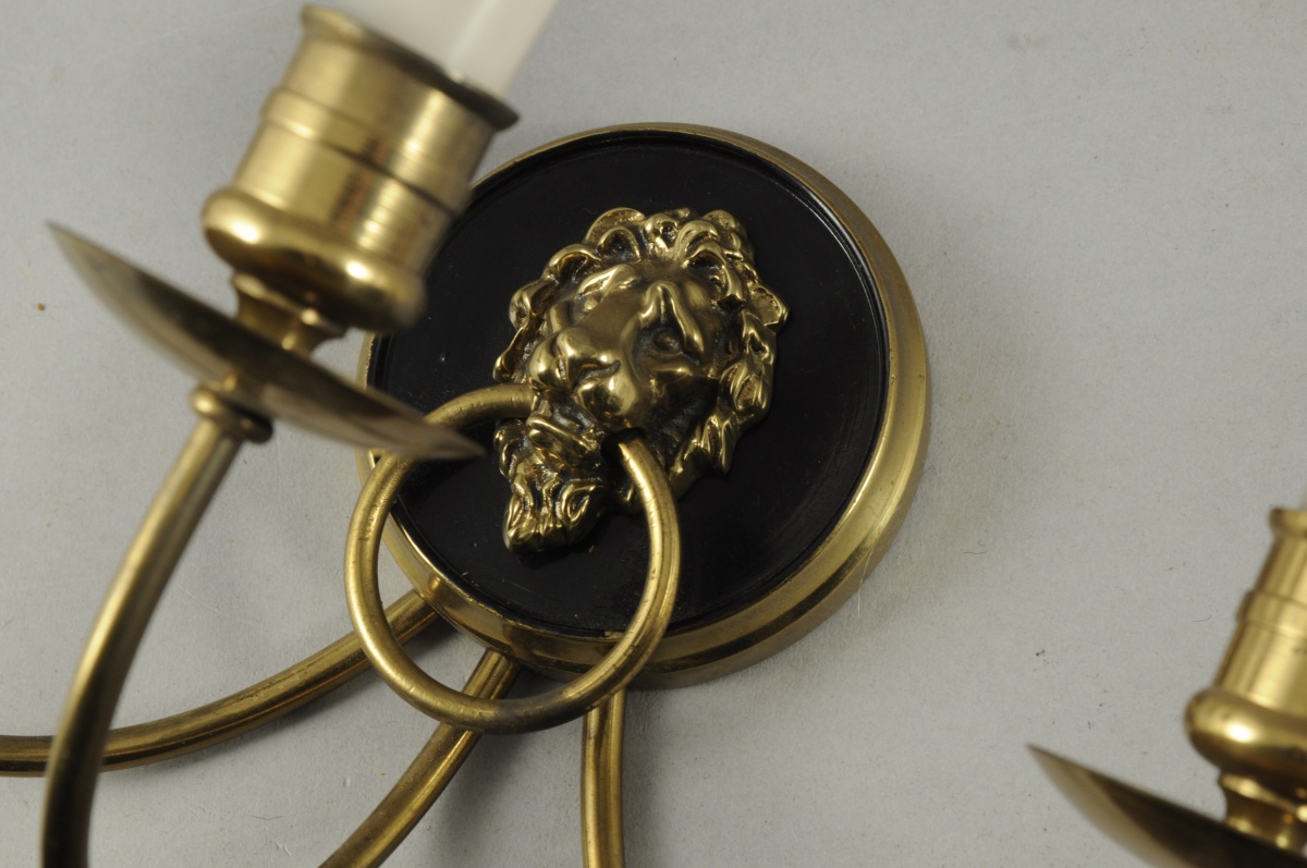 PAIRE d'APPLIQUES en laiton à trois bras de lumières. Décor sur la base d'un butoir en forme de tête de lion tenant dans sa gueule un anneau. Montées à l'électricité.