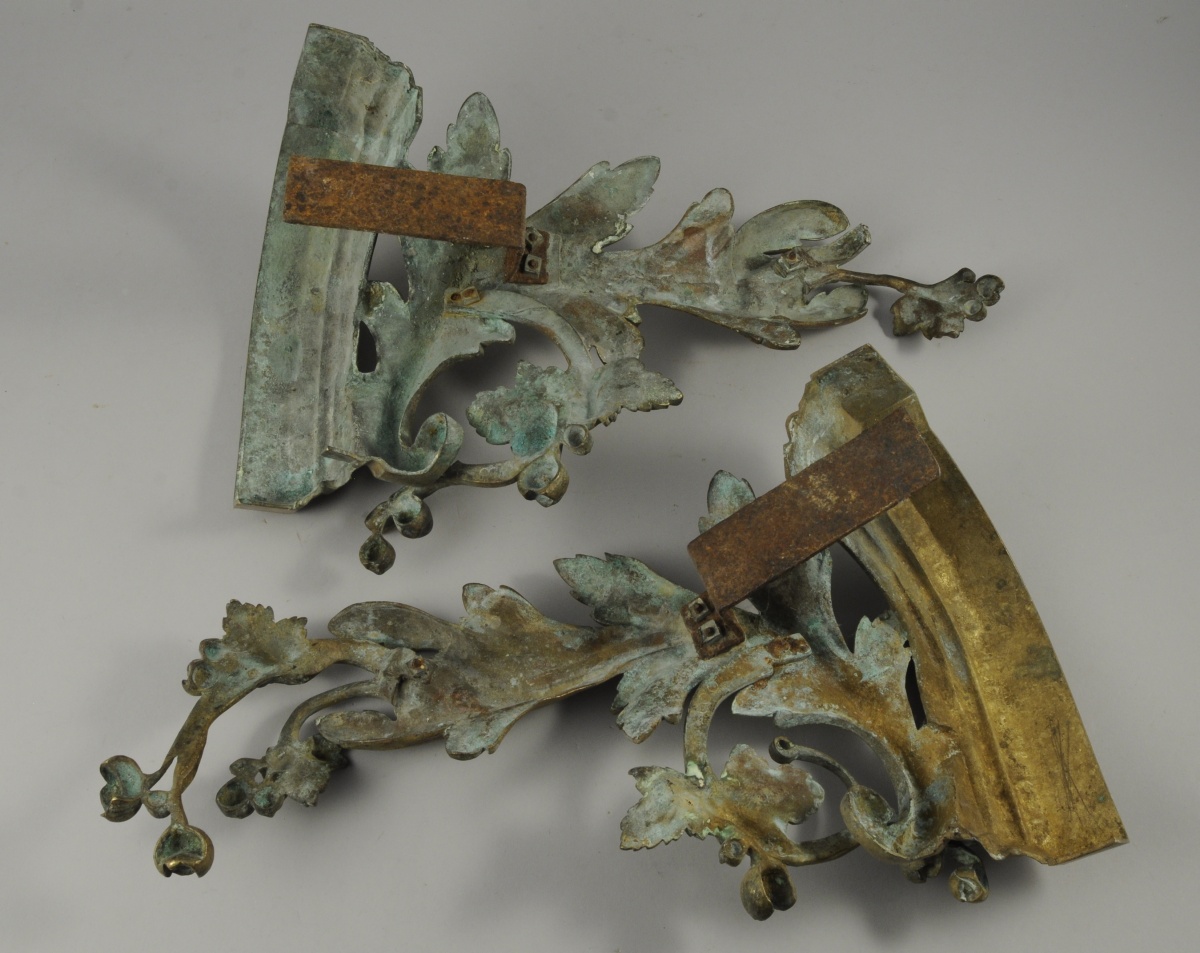 PAIRE de TÊTES de CHENETS en bronze doré à décor ajouré de rinceaux feuillagés et fruits. La base moulurée à décor d'oves. Style Louis XV, milieu du XIXème.