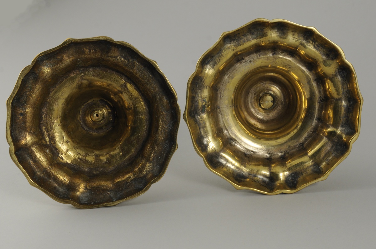 PAIRE DE FLAMBEAUX en laiton. Base mouvementée, fût de forme balustre. Décor de moulures.