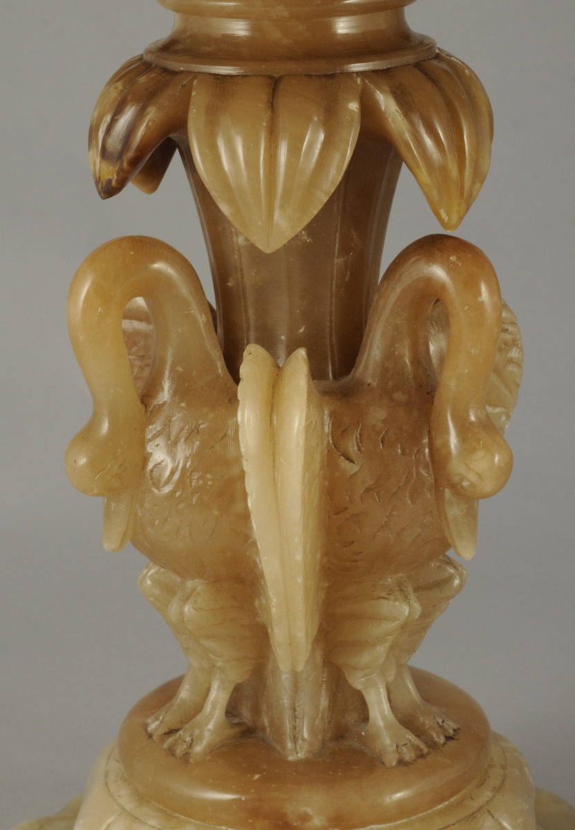COUPE en albâtre : vasque aux pampres et raisins, reposant sur un socle de trois cygnes dressés, se terminant en piedouche de 3 coquilles alternés de 3 griffes.