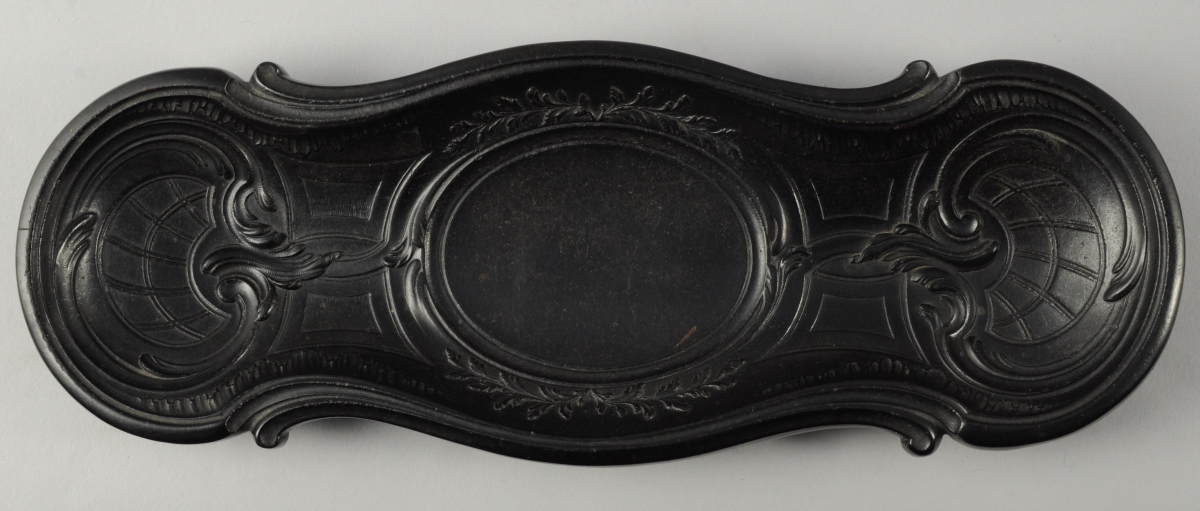 ENSEMBLE comprenant trois COUPES, une oblongue et deux circulaires, en gomme laquée moulée. Décor floral de style Art Nouveau, pour l'une et d'agraphes et rinceaux feuillagés de style Louis XV, pour les deux autres. Début XXème.