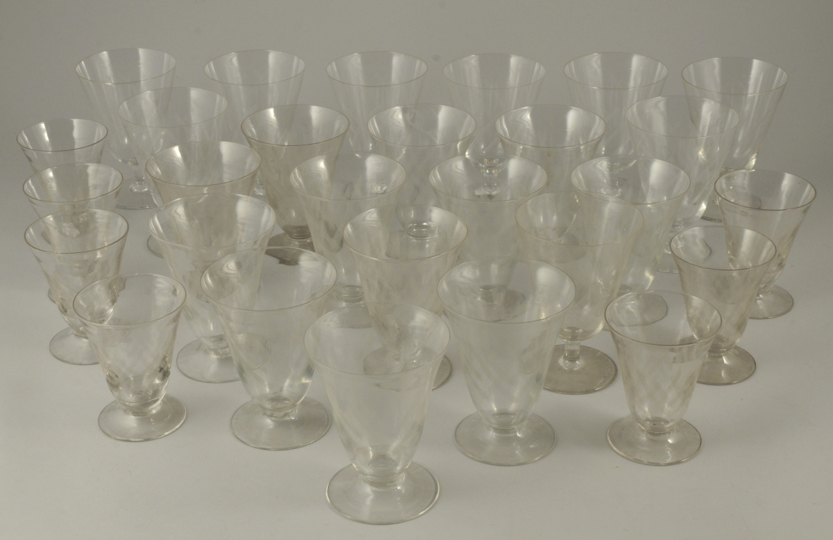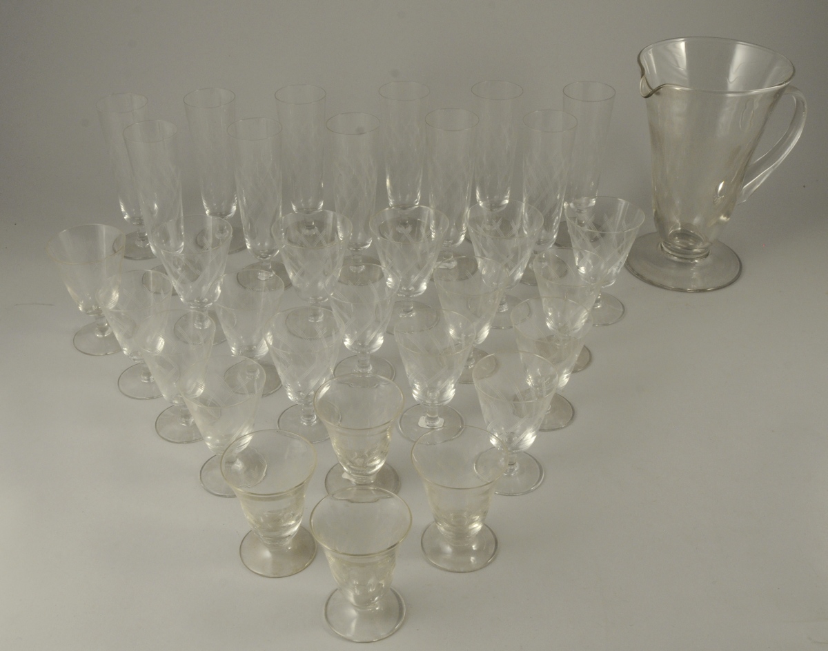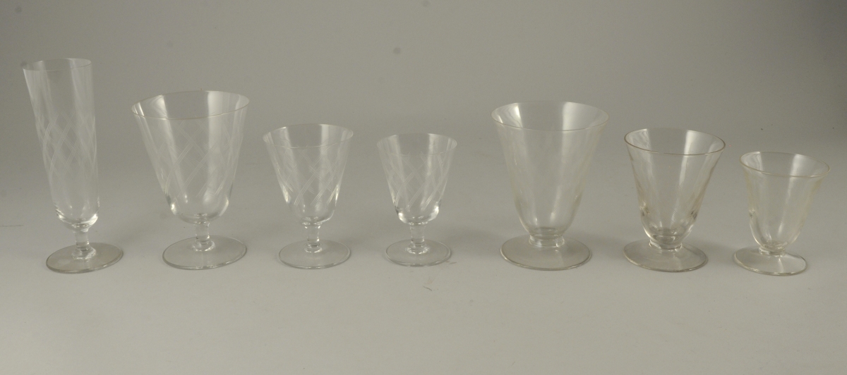 PARTIE de SERVICE de 61 pièces en verre gravé à la roue de croisillons comprenant un broc, 11 flûtes à champagne, 9 verres à vin, 12 verres à eau, 7 verres à porto, 6 petits verres, 12 verres à liqueur et 3 verres à liqueur. Milieu du XXème. Haut. du broc 20,5 cm. (légers éclats)