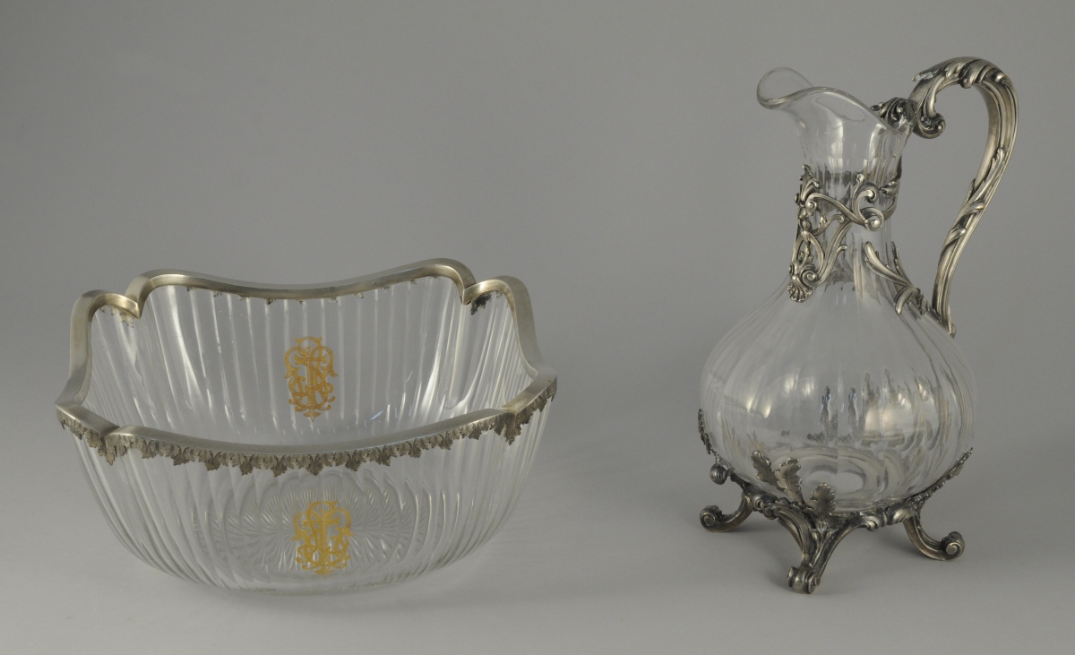 CARAFE À VIN et SALADIER de forme rectangulaire en cristal à montures feuillagées en bronze argenté. XIXème, XXème.