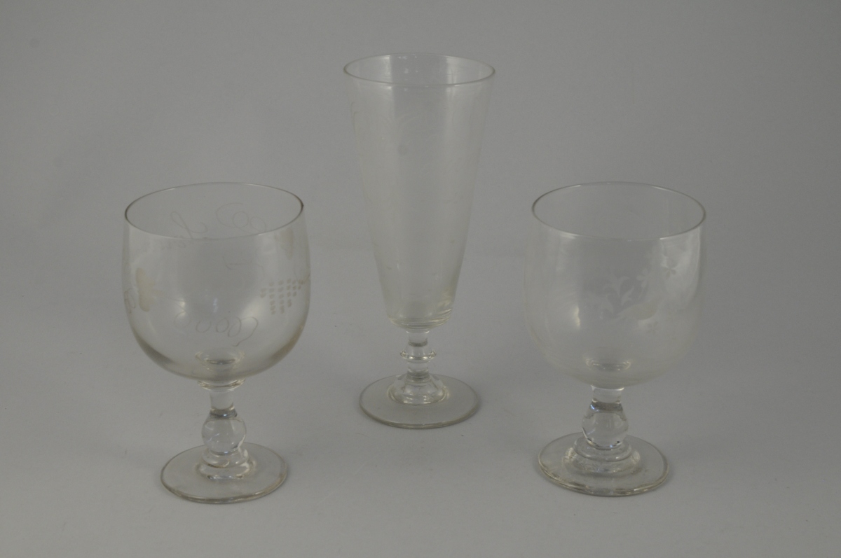 -Deux verres à pied balustre. L'un marqué "Souvenir" et décoré de motifs végétaux stylisés, l'autre à décor d'oiseaux et de fleurs.