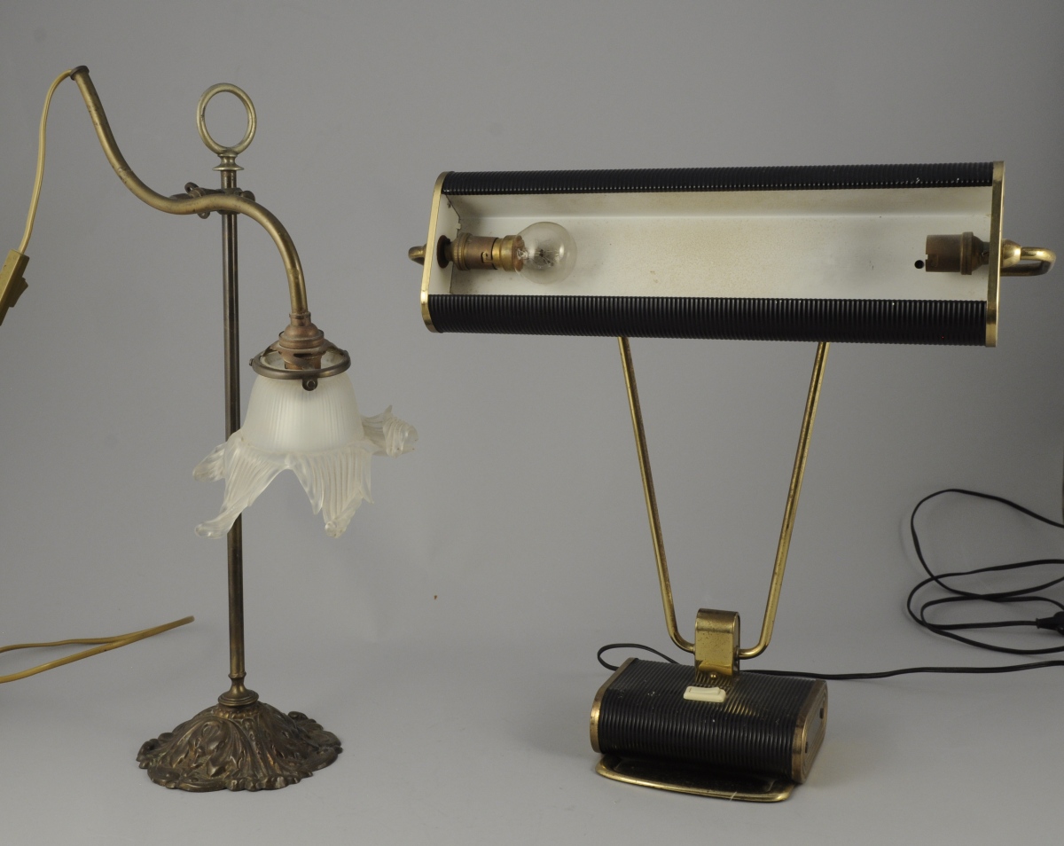 LAMPE articulée en métal. Pied à décor au repoussé de feuilles d'acanthe et raies de perles. Tulipe mouvementée en verre opalescent. Elle est sommée d'un anneau de préhension.