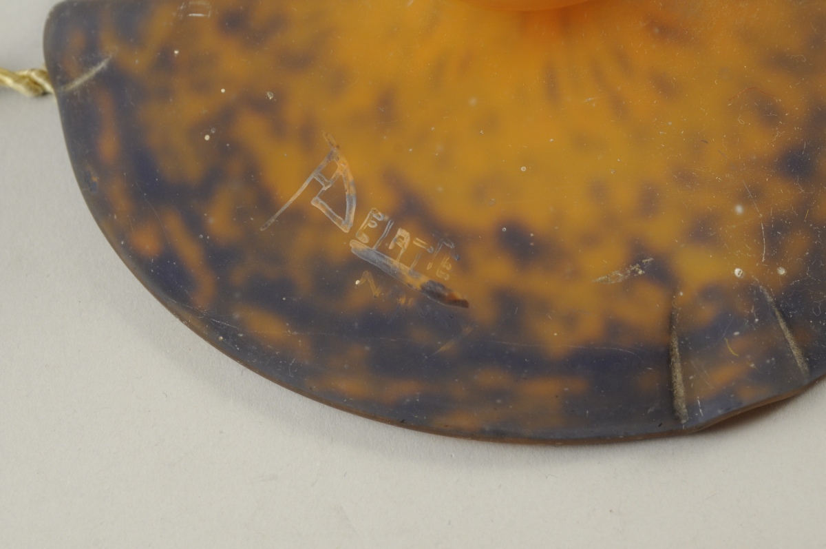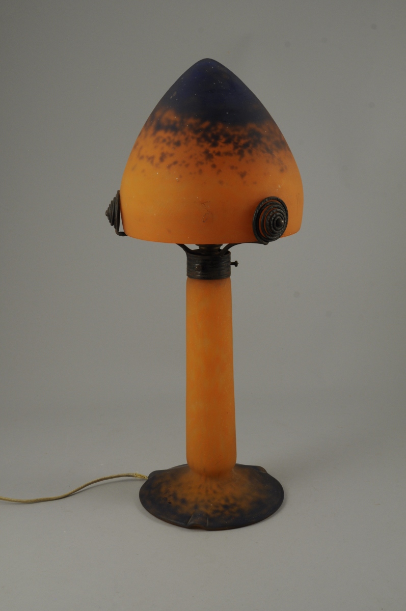DELATTE. LAMPE champignon en verre marmoréen orange et bleu. Montures de forme hélicoïdale en fer forgé et martelé. Signée P. DELATTE à Nancy. Premier quart du XXème.